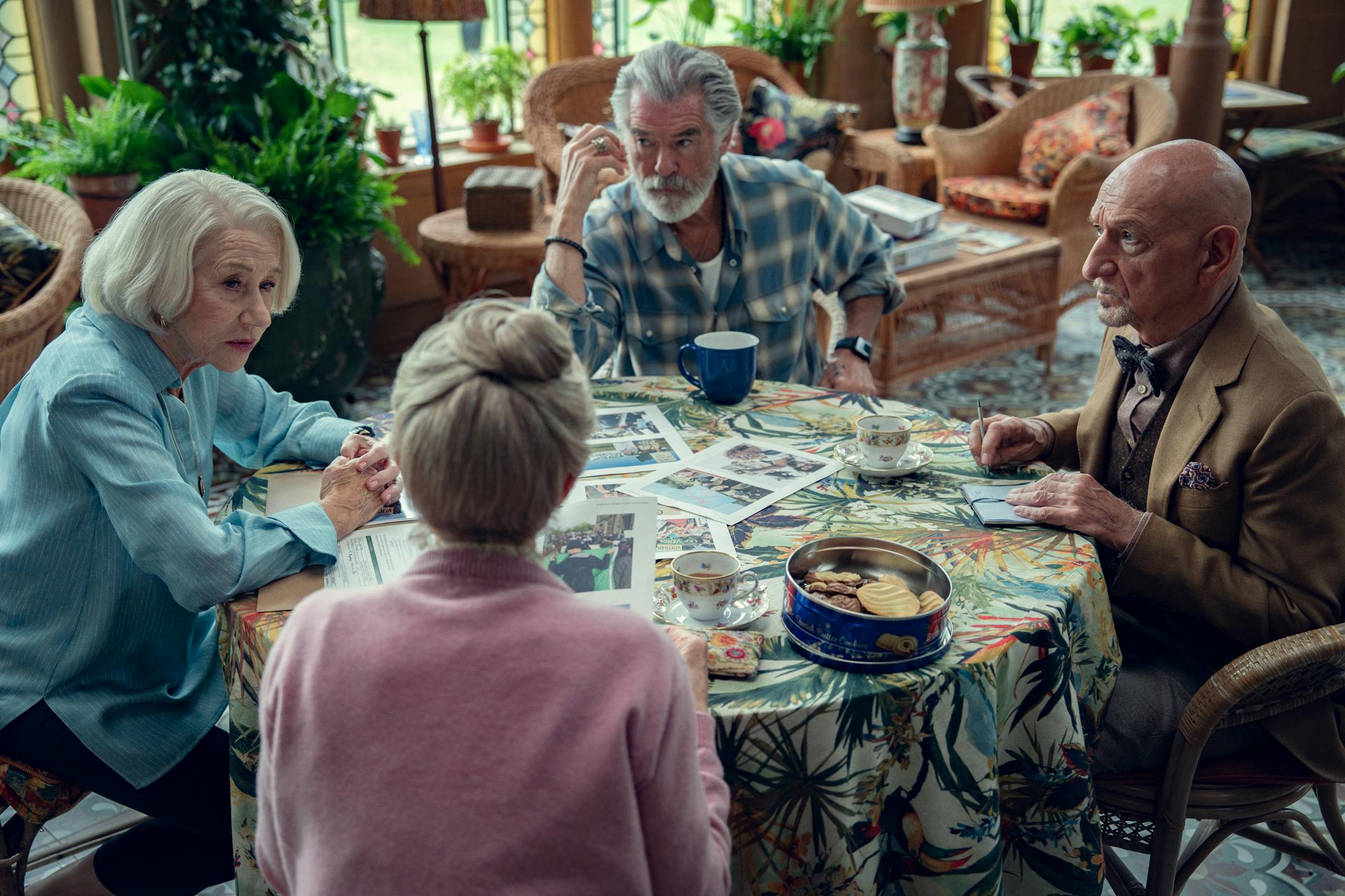 The movie truncates the origins story of the four, who all live in a deluxe retirement community in England. They are led by canny former spy Elizabeth (played by Helen Mirren in the film) and also include scattered-but-surprisingly-insightful-about-people Joyce (Celia Imrie, who’s much less scattered in the film version), strongman Ron (Brosnan) and nerdy ex-psychiatrist Ibrahim (Ben Kingsley).