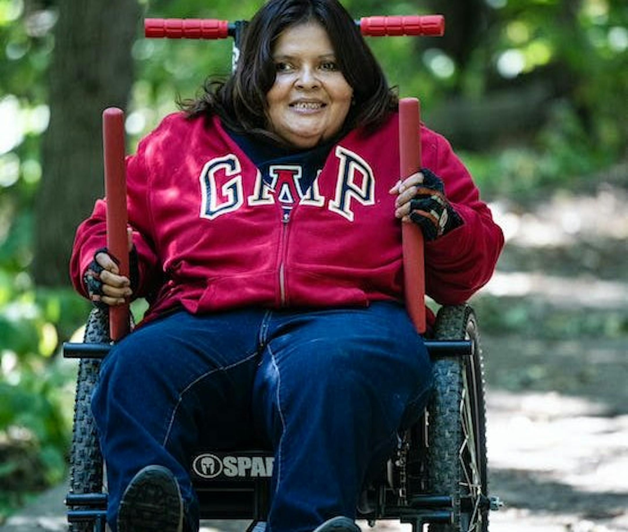 Schmidt, 45, has cerebral palsy. She can't traverse rough surfaces on her regular wheelchair without somebody pushing it. Now, as sunlight flickered between the trees, Schmidt rolled along the crushed limestone on her own steam.