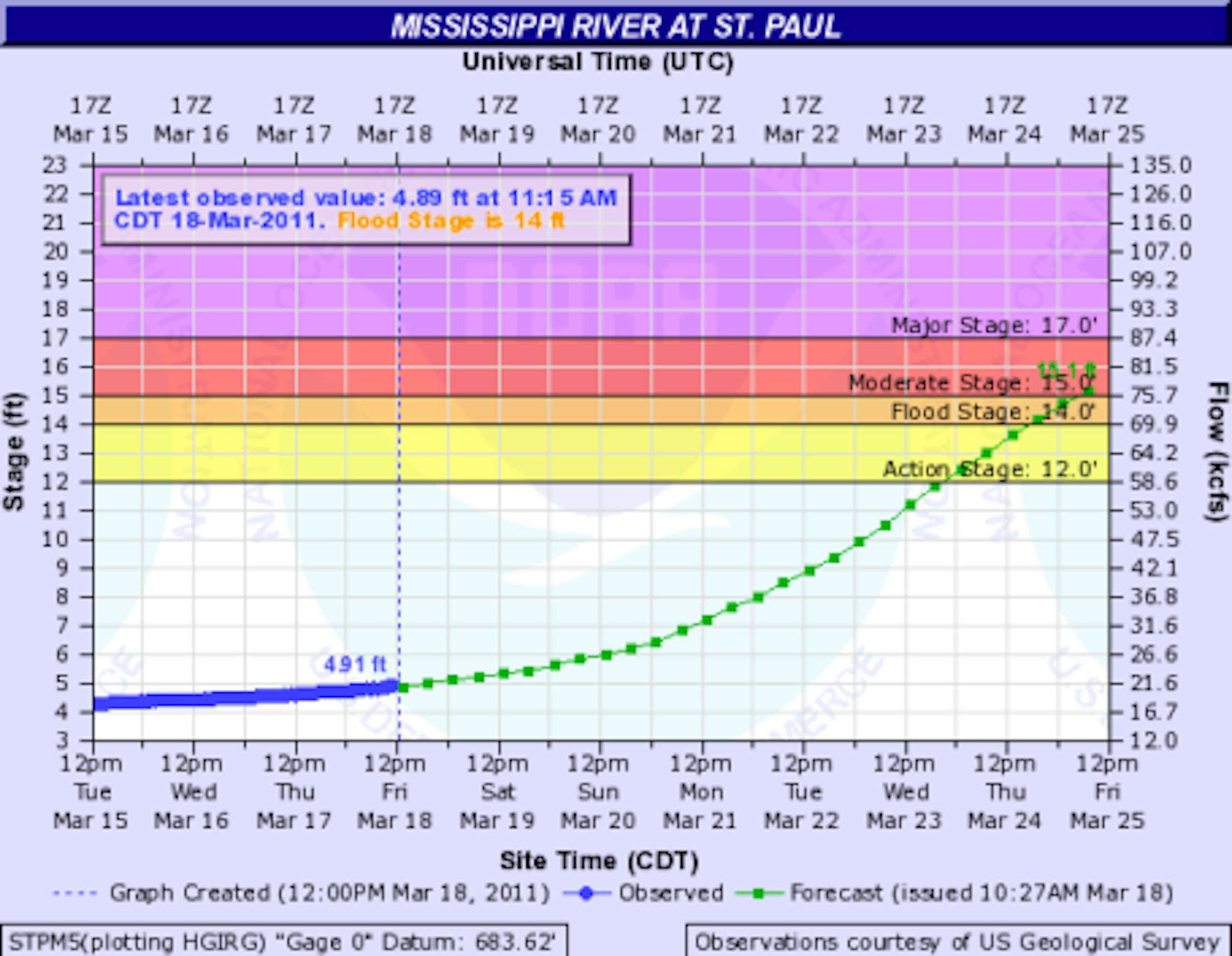 The Frank Theater production is set to run through March 27 on board the Centennial Showboat at Harriet Island in downtown St. Paul. And while director and Frank founder Wendy Knox expresses confidence that the show will go on, the City of St. Paul forecast, charted above, has rising waters hitting the "action stage" next Wednesday and flood stage soon after that.