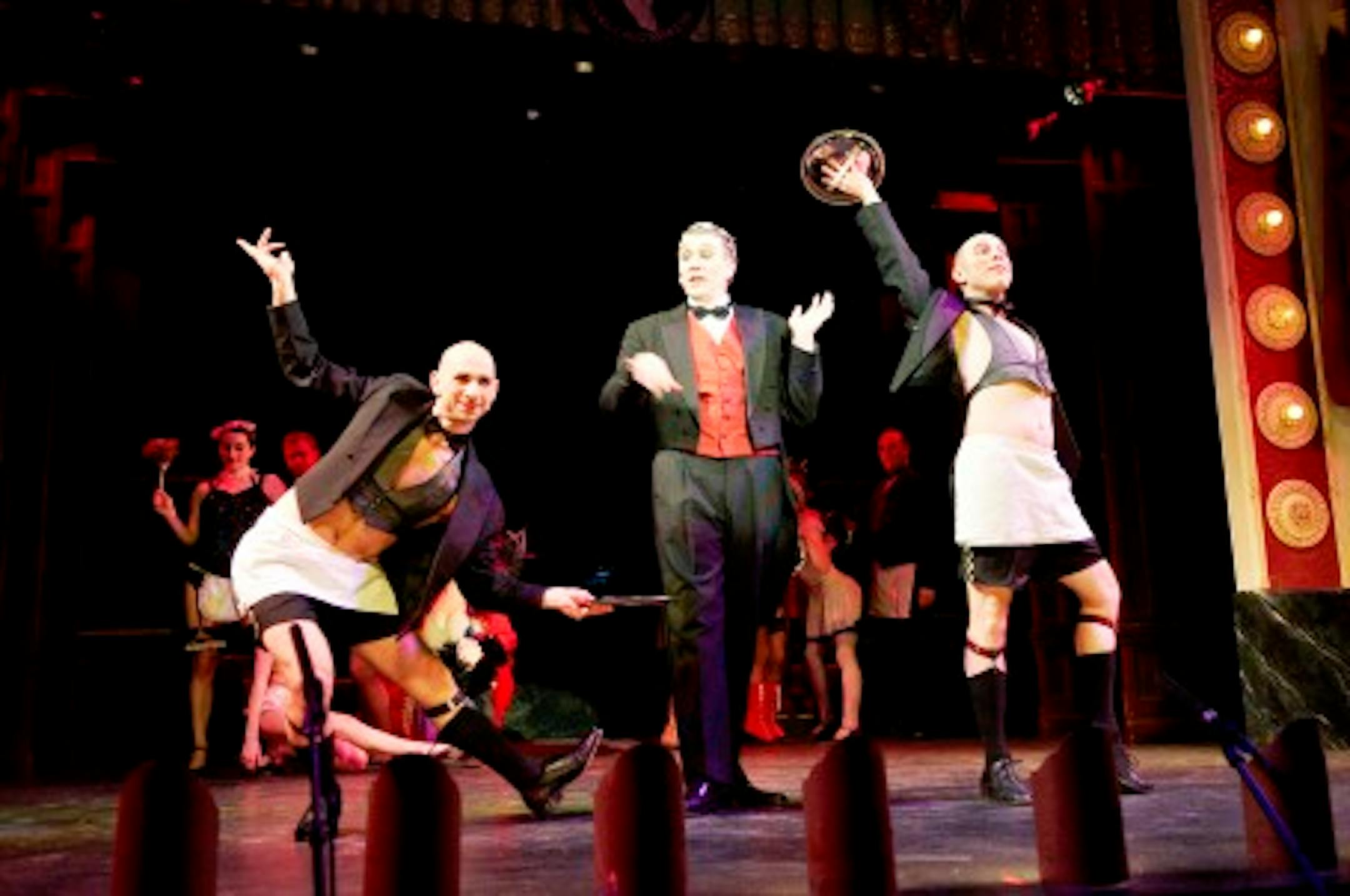 Bradley Greenwald, center, as the Emcee in "Cabaret," which so far has remained above water.