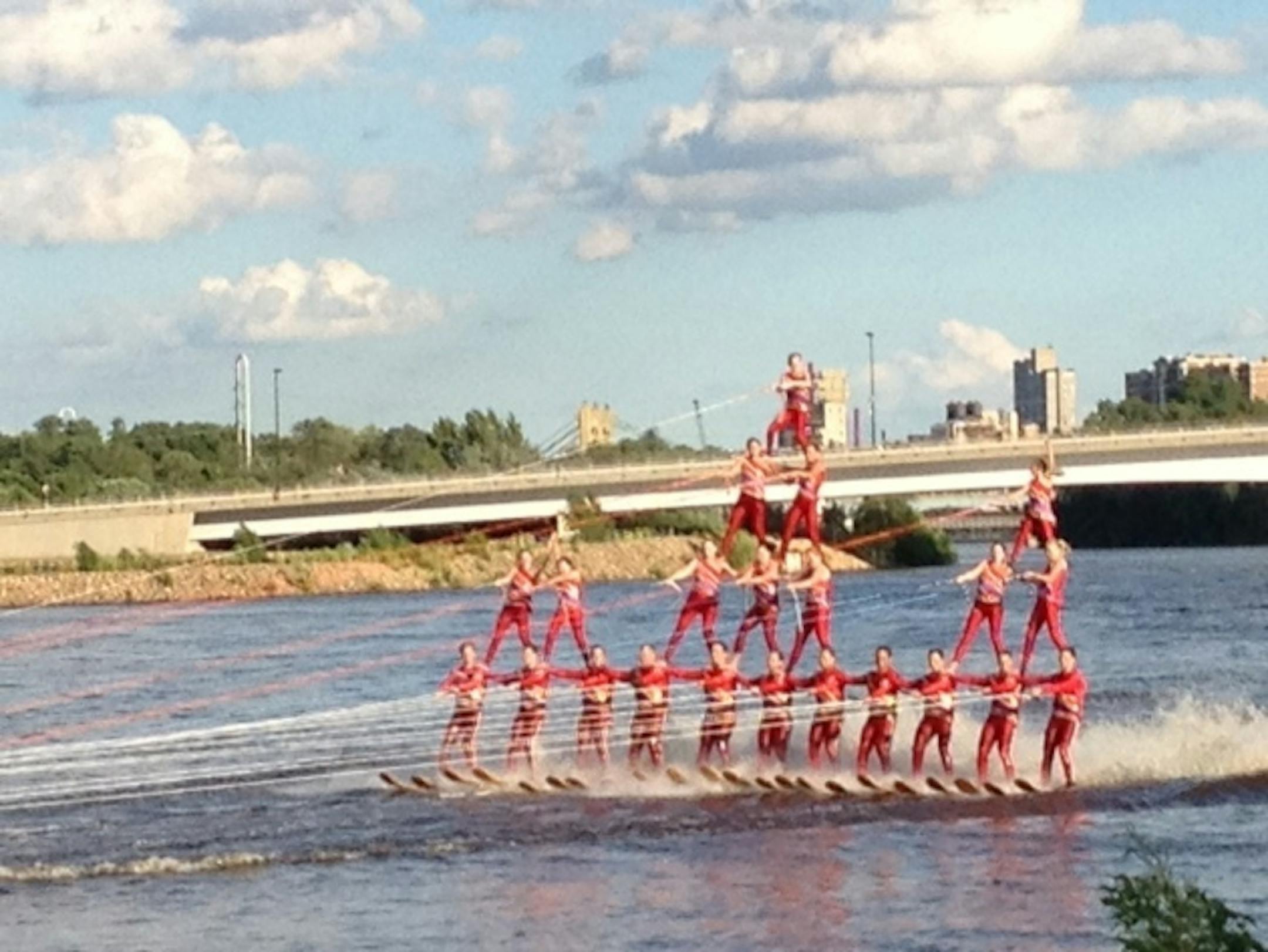 The amateur water ski team has been putting on shows in it's current location just south of the Broadway bridge since the late 1990s. The team also competes in tournaments and provides lessons. It accepts new members, especially the really tiny ones who are brave enough to climb to the top of a pyramid.