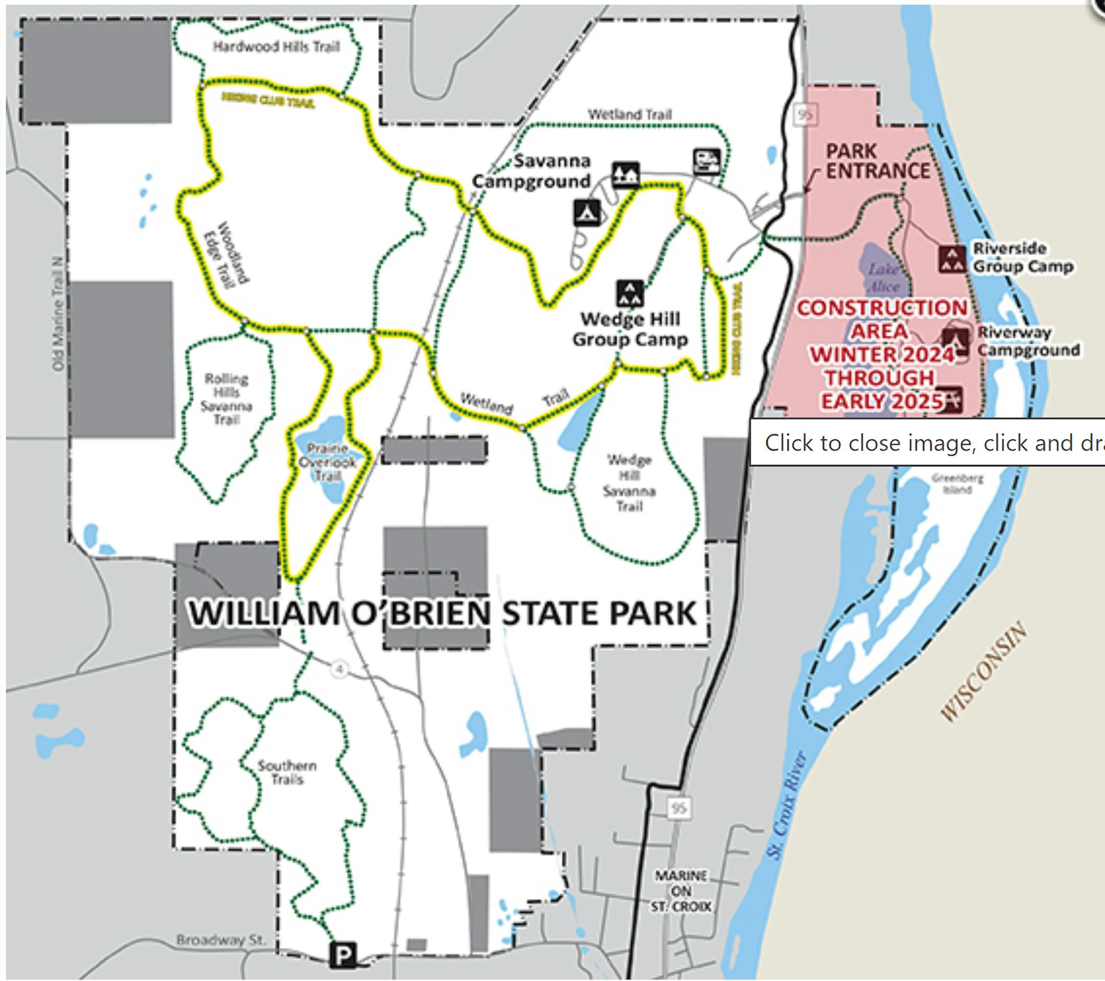 The lower section of William O’Brien State Park in Marine on St. Croix has closed until next year to allow for a $4.1 million remake of the trails and buildings, including a new picnic shelter, accessibility upgrades to the two existing shelters, two new bathroom buildings, improvements to the Riverway campground shower building, a larger swim beach at Lake Alice and more green space.