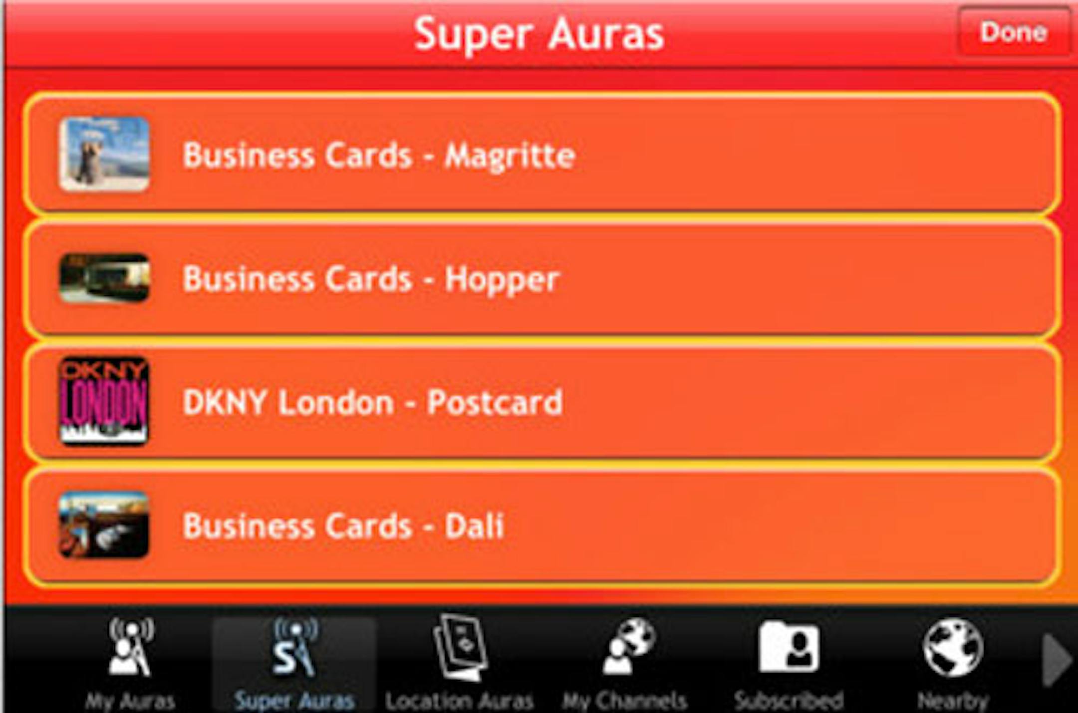 The icons on the bottom say My Auras, Super Auras, and Location Auras. Apparently you can make, or use, or look at, business cards based on the famous works of famous painters. It uses the "Aurasma Technology," the app site says. Well, that leads to this.