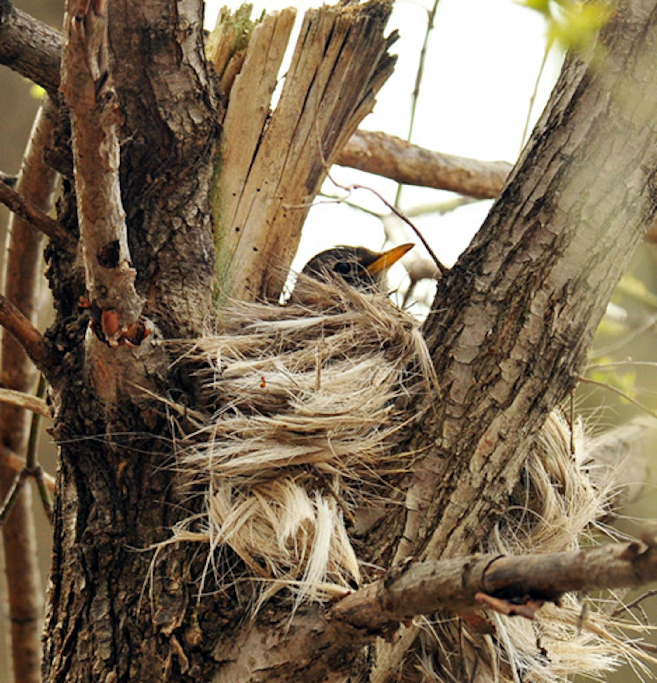 Here is a robin's nest, an unusual nest because it seems to contain what appears to be deer hair, a lot of deer hair. I found it at Westwood Hills Nature Center in St. Louis Park. The Birds of North America monograph on American Robin describes the typical nest made by this species: an outer wall of dead grass and twigs lined with mud, the cup finished with dead grass. The mud is said to be from worm castings. Occasionally, white paper, feathers, rootlets, and moss are added, according to the authors. No mention is made of hair. There are many deer at Westwood Hills. The bird apparently made use of available materials. I once watched a robin building a nest, a conventional nest with grass and mud. The bird shaped the mud by rotating its body in the cup, using its breast and stomach to spread the mud on the nest walls. I wanted to see the inside of this nest to know if a more conventional approach was taken with cup construction.