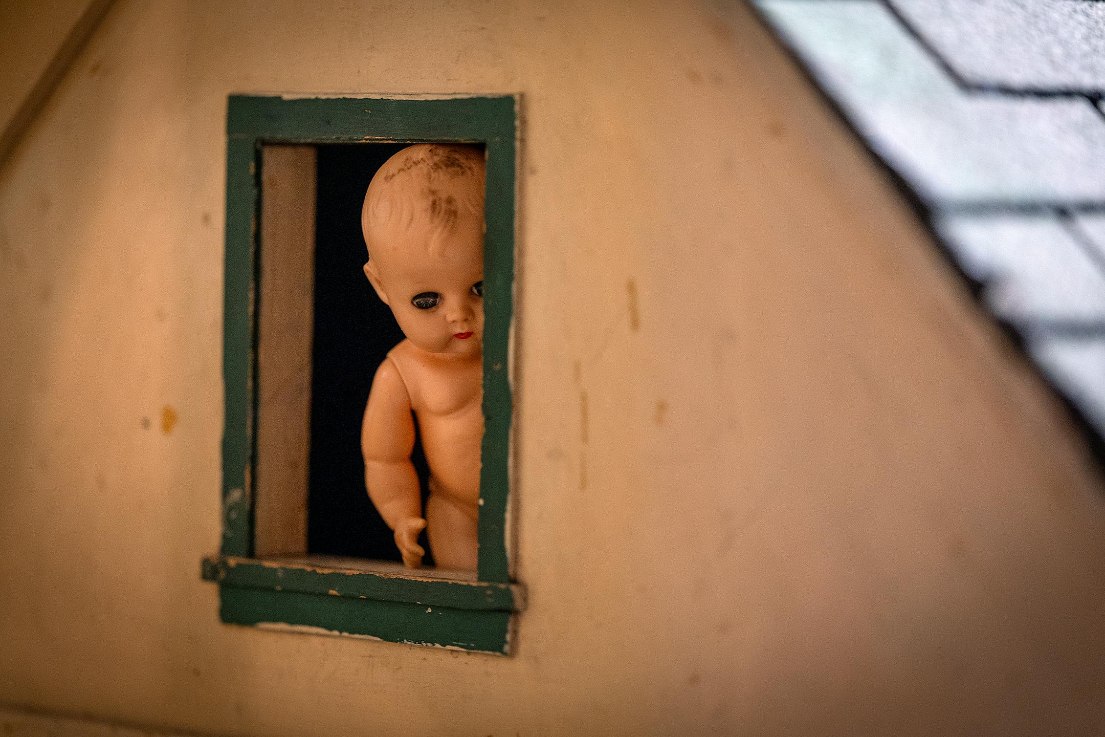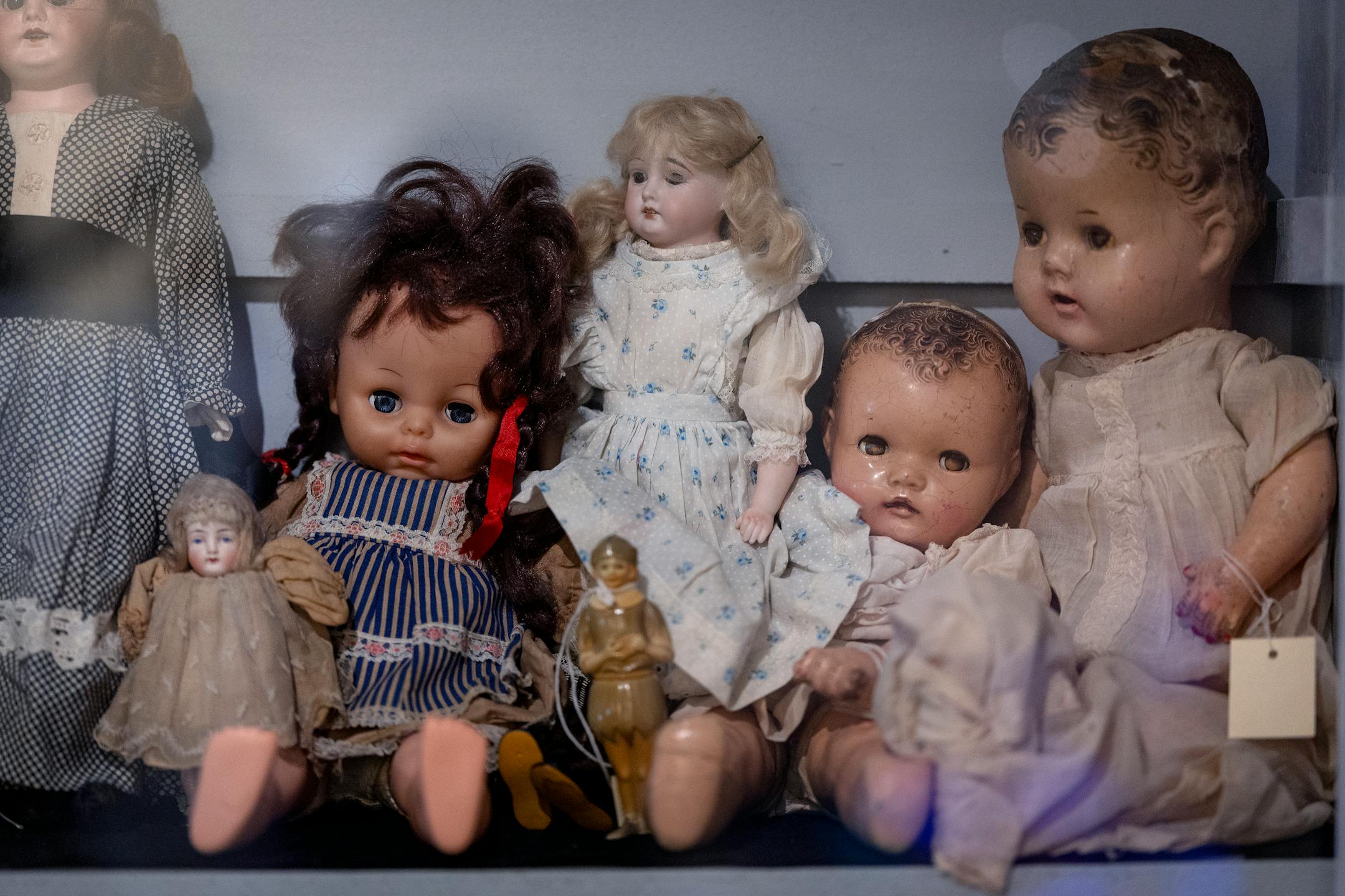 Dozens of time-worn dolls and children’s toys adorn the walls, hang from the ceiling and stare up from the floor, some in faded dollhouses more than a century old.
