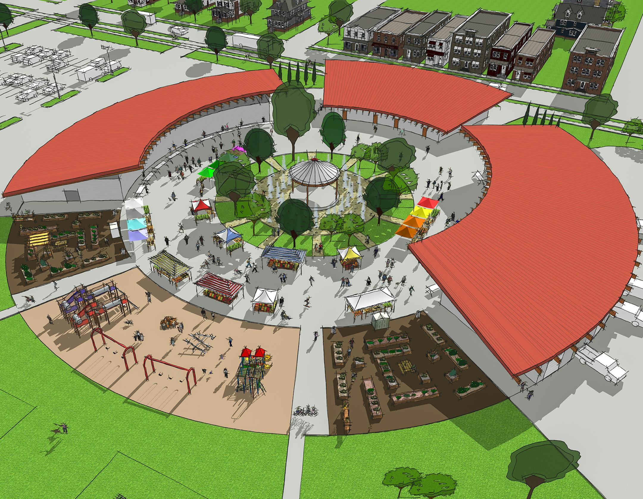 The drawing shows a circular set of covered stalls surrounding a green space, with a playground, commercial kitchen, restrooms, community space, office and areas for expansion.