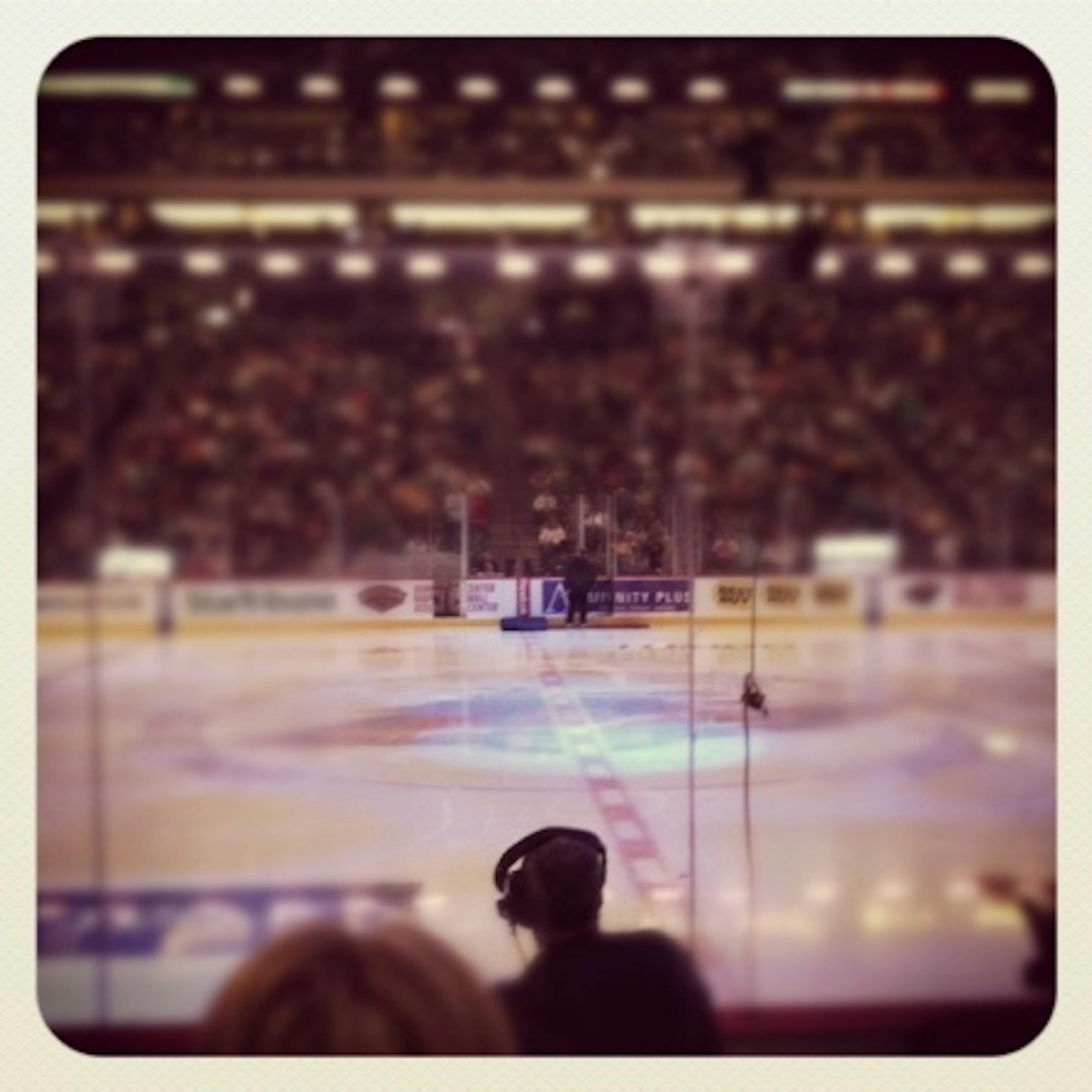 6:47 PM – Back in St. Paul, after another stealthy parking job, we began engaging with our second scalper of the day. Between the two of us, RandBall and I have collected five college degrees. But apparently all of that brain power wasn't enough to make sure we had plenty of cash. The guy was only asking face value for the tickets and we didn't have quite enough. Luckily he was willing to get stiffed for a few bucks to get rid of the ducats. 7:03 PM – These are much nicer seats, only three rows away from the players' benches. There is a much greater level of energy in the building than there was this afternoon. There is the occasional, random Denver fan here and there but there is no doubt that this is going to be a pro-UND crowd. We were seats one and two in the row so I decided to take seat one and let RandBall deal with whatever goofball we get stuck next to this time around.