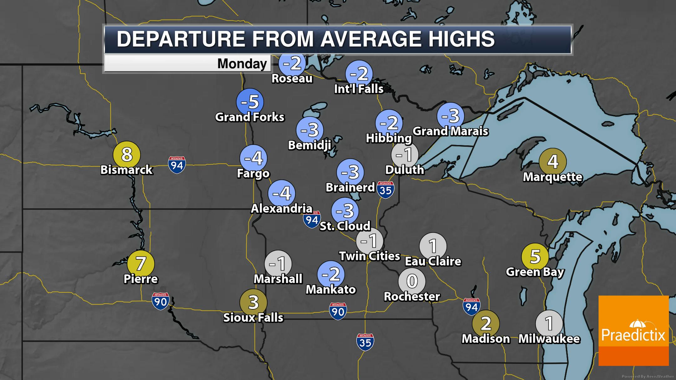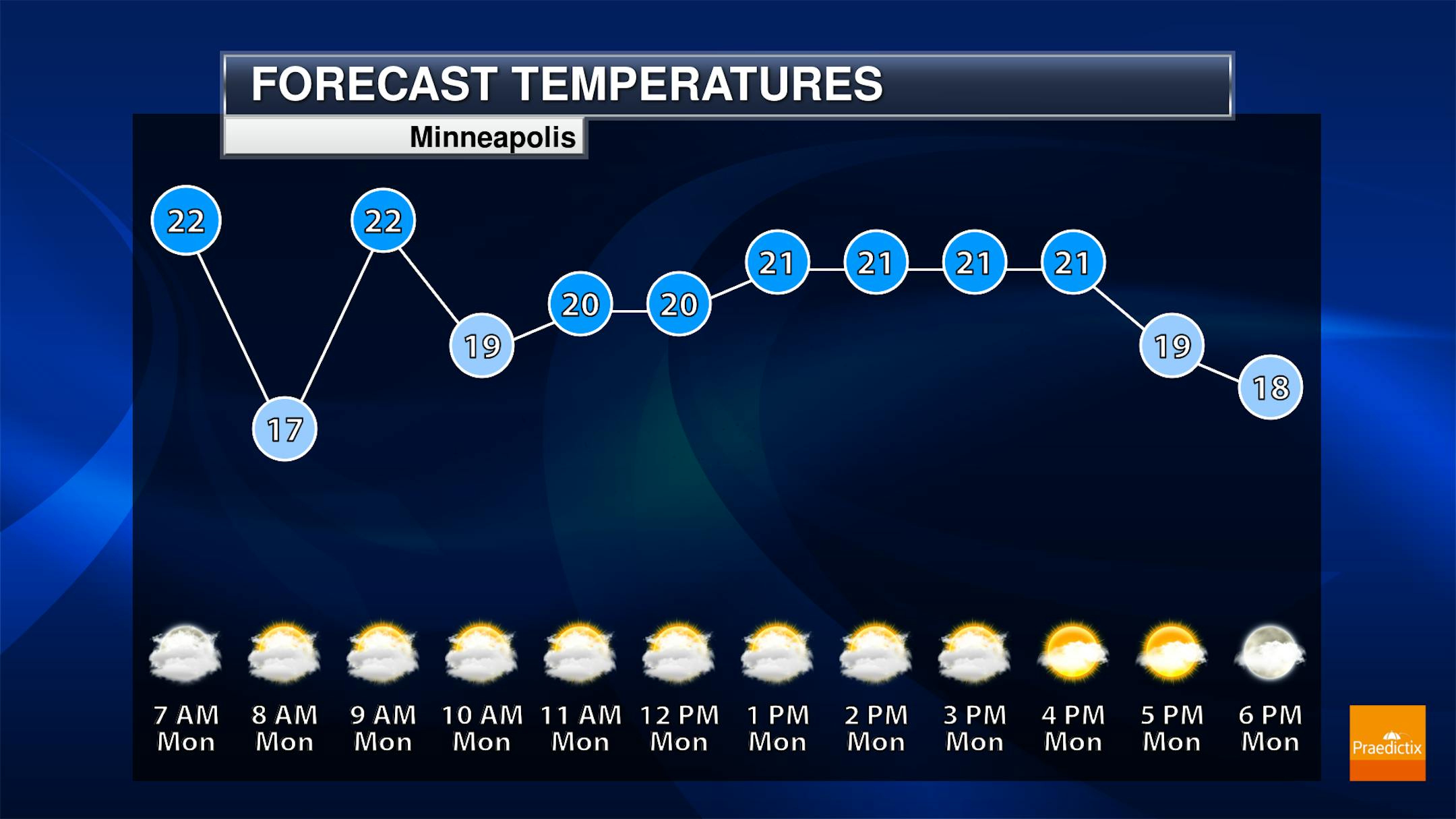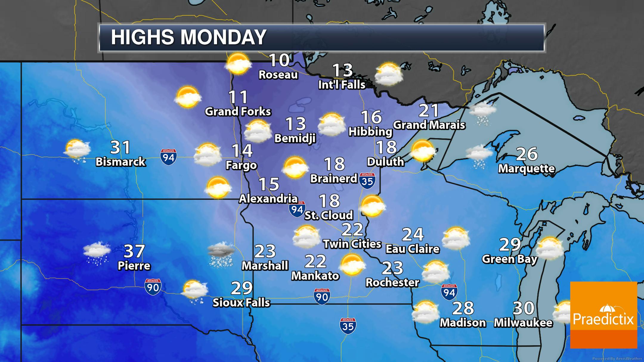 It's going to be a very up and down temperature week here in the Twin Cities. A cold front will move through the region by Monday morning, keeping highs slightly below average Monday in the low 20s and then 5-10F degrees below average Tuesday in the mid/upper teens. After a warm front, highs will quickly climb back into the 30s for Wednesday and Thursday before they collapse back into the teens once again Friday.