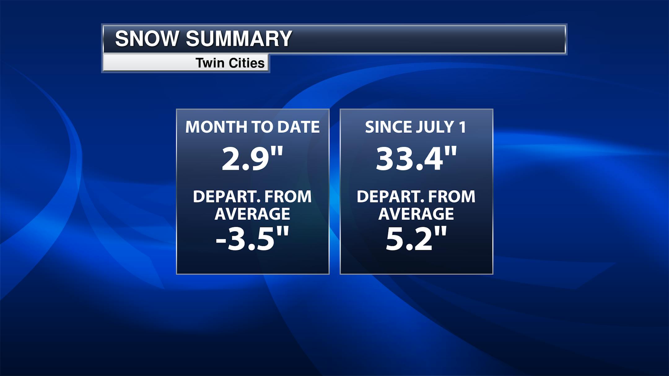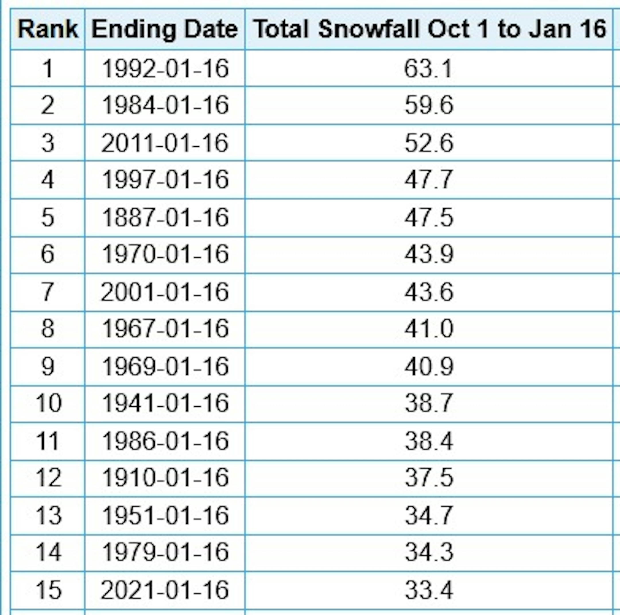 While it has been a relatively non-snowy January so far, we are a little over 5" above average for the full snow season so far in the Twin Cities. This is the 15th snowiest start to the snow season on record, and the most snow we've seen so far in the snow season since 2010-2011 when we already had 52.6" of snow. You can see the top fifteen rankings for MSP below: