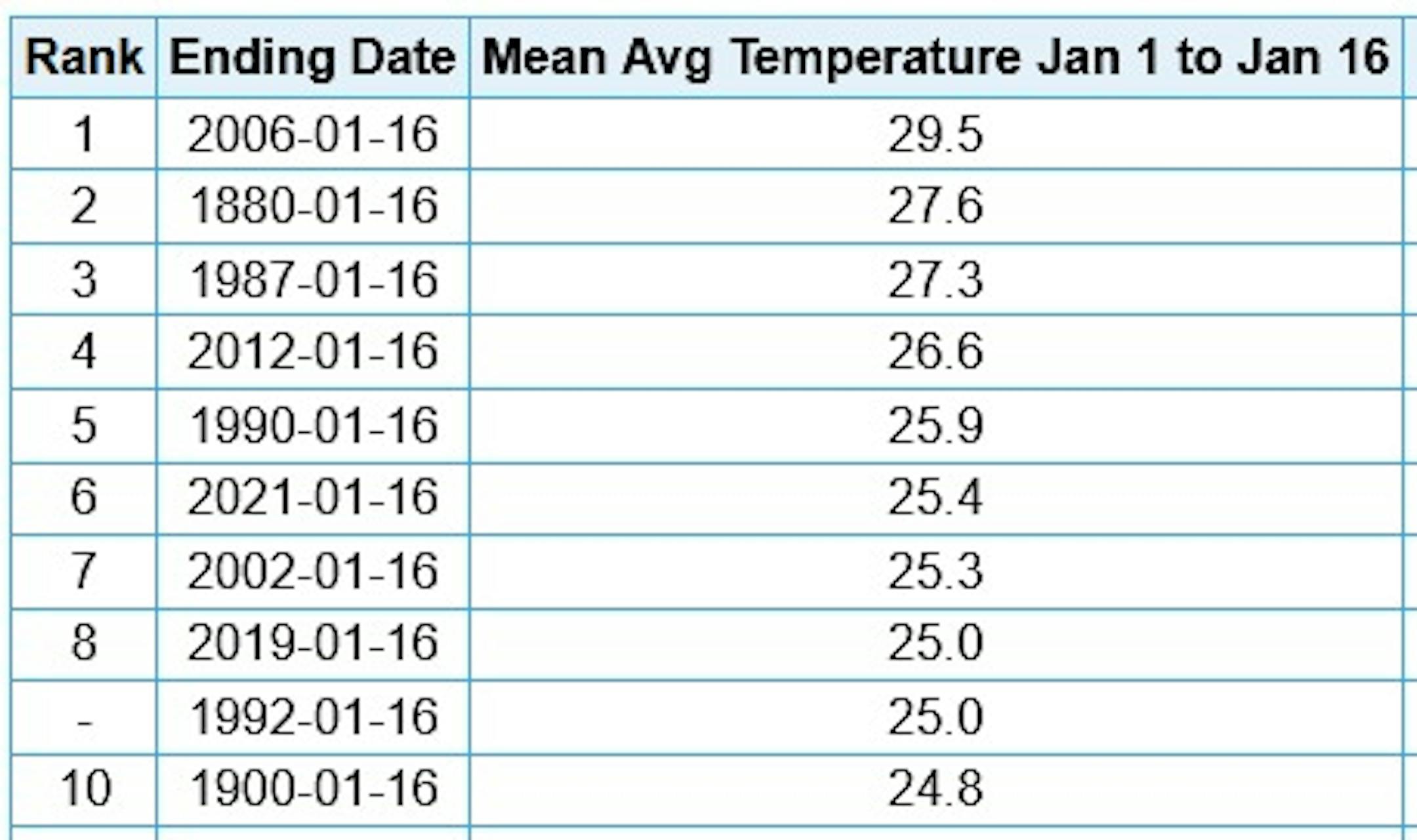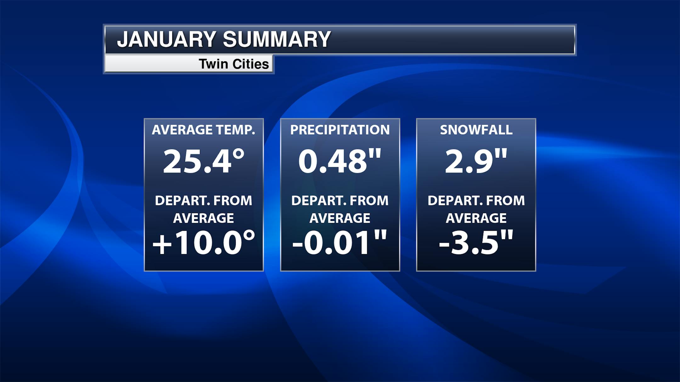 With a lot of clouds and fog to begin the month here in the Twin Cities, it has been quite a warm first half of the month. Through Saturday, the average temperature has been exactly 10F degrees above average, making it the 6th warmest start to January on record. Below you can see the top ten warmest starts to January. Meanwhile, while we are right around average for precipitation (rain/melted wintry precipitation), we have only received 2.9" of snow so far. All of that fell with our snow event to end the work week last week, although we have also observed three days with a trace of snow (4th, 9th, 16th). The snow so far this month is 3.5" below average.