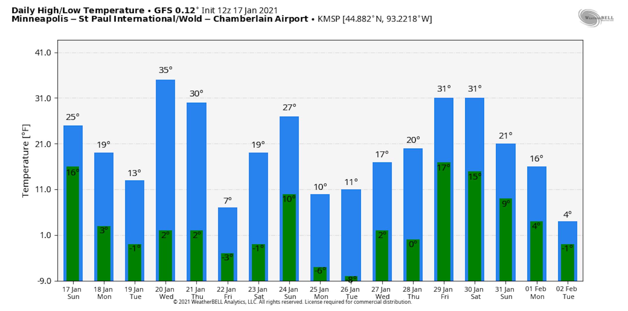 You can see the rollercoaster temperatures not only expected this week but potentially through the end of the month here in the Twin Cities on the American GFS model.
