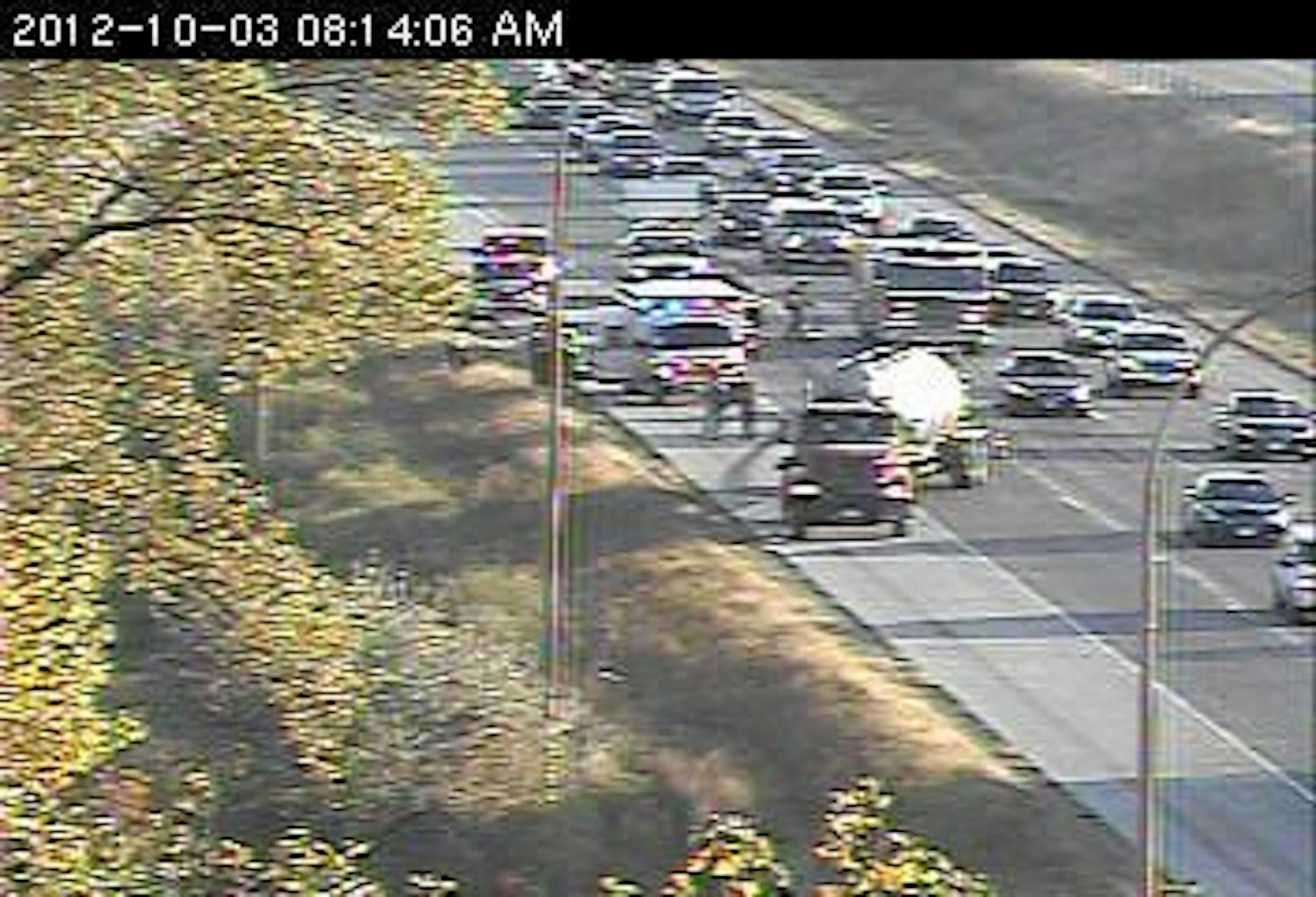 A rollover crash on southbound 494 at Lake Road in Woodbury is creating a backup. Emergency vehicles are on the scene and the right lane is blocked.