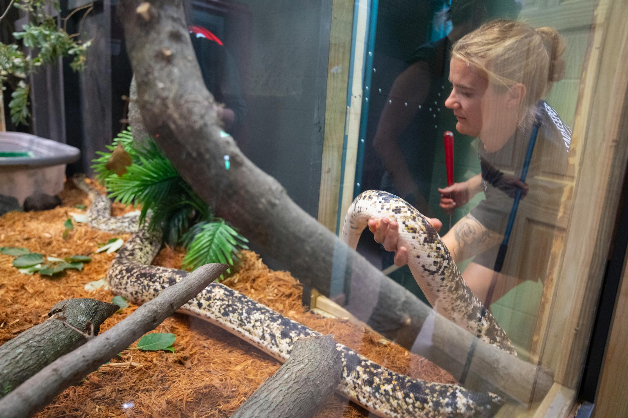 Rumen, a reticulated python, soaked up the warmth of the primate building floor as handlers carefully measured his languid body. Then, ferried by snake-wrangling hooks, he was placed inside his new habitat — several times larger than his exhibit at his previous home, the Roseville SeaQuest.