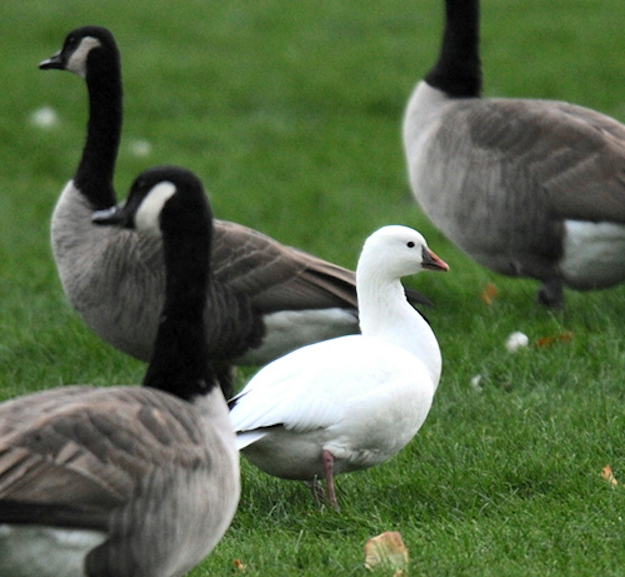 A Ross's Goose, least common of the goose species to be seen in Minnesota, has spent the past several days in Hopkins. Tuesday it was present from early afternoon until dusk at Central Park in Hopkins. The park is adjacent to Excelsior Blvd., just west of 17th Ave. S. The Ross's Goose has been keeping company with several dozen Canada Geese. Ross's is a small goose, no larger than a Mallard, with plumage very similar to Snow Goose. It would be expected to be seen in small numbers the far western portion of the state. It is a beautiful bird.