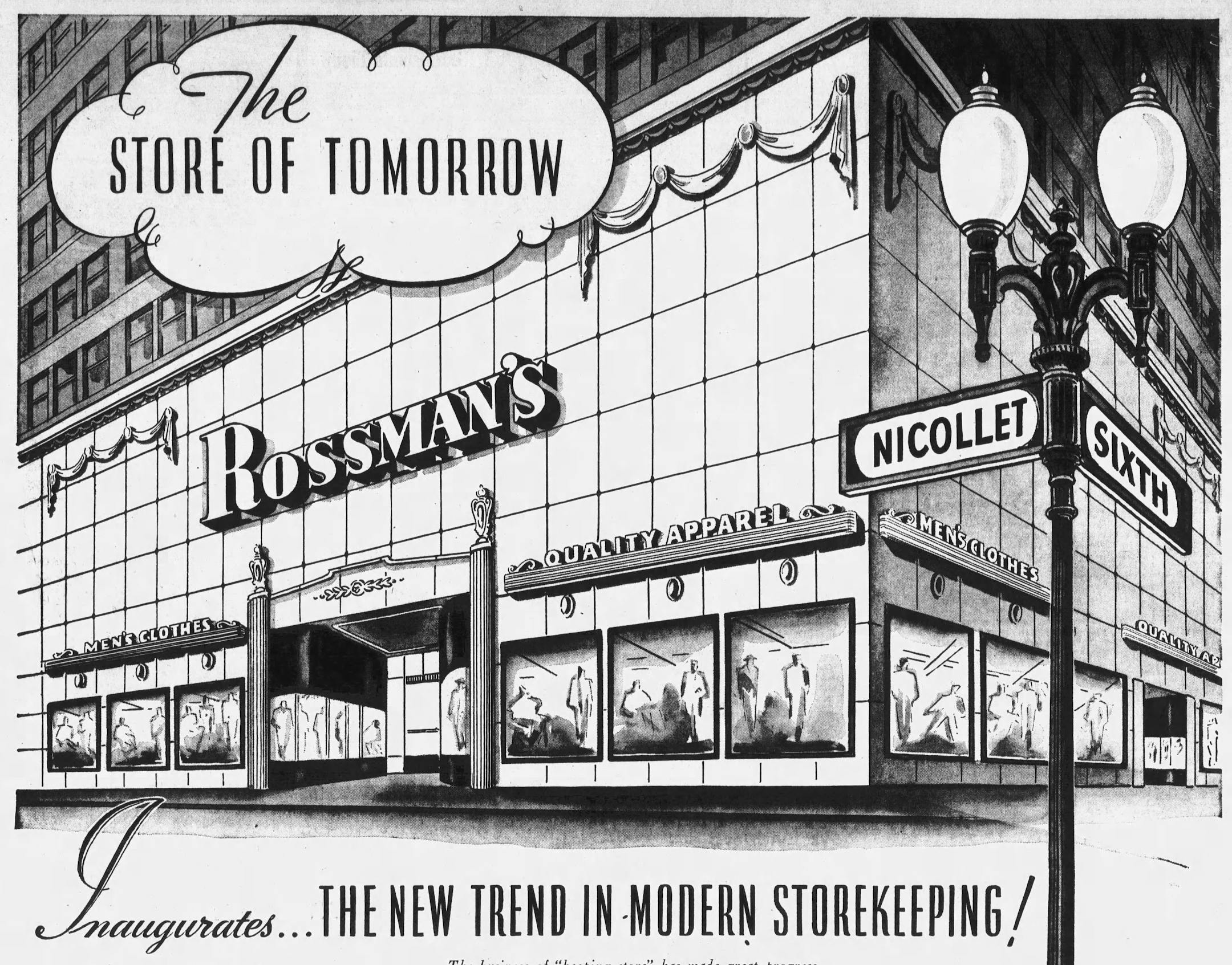 Rossman's "Store of Tomorrow" opened in April 1941 on the corner of Nicollet and 6th, in the Syndicate building. It was an old structure, built in 1883; the corner had housed the Standard Clothing store until its demise in 1940. The Rossman brothers, John and Eli, poured more than $135,000 into the renovation ($2.6 million in modern dollars) and gave downtown Minneapolis an up-to-date storefront. Limestone faced the corner; bronze trim provided contrast. Inside, "Scientific Management" and "Creative Designing" gave shoppers a modern experience, as the ad described: "Here Summer or Winter you will be able to enjoy the most modern air-conditioning; you will be served from the newest store fixtures; and you will 'see what you see' under miraculous fluorescent lighting — the veritable modern Aladdin's Lamp."