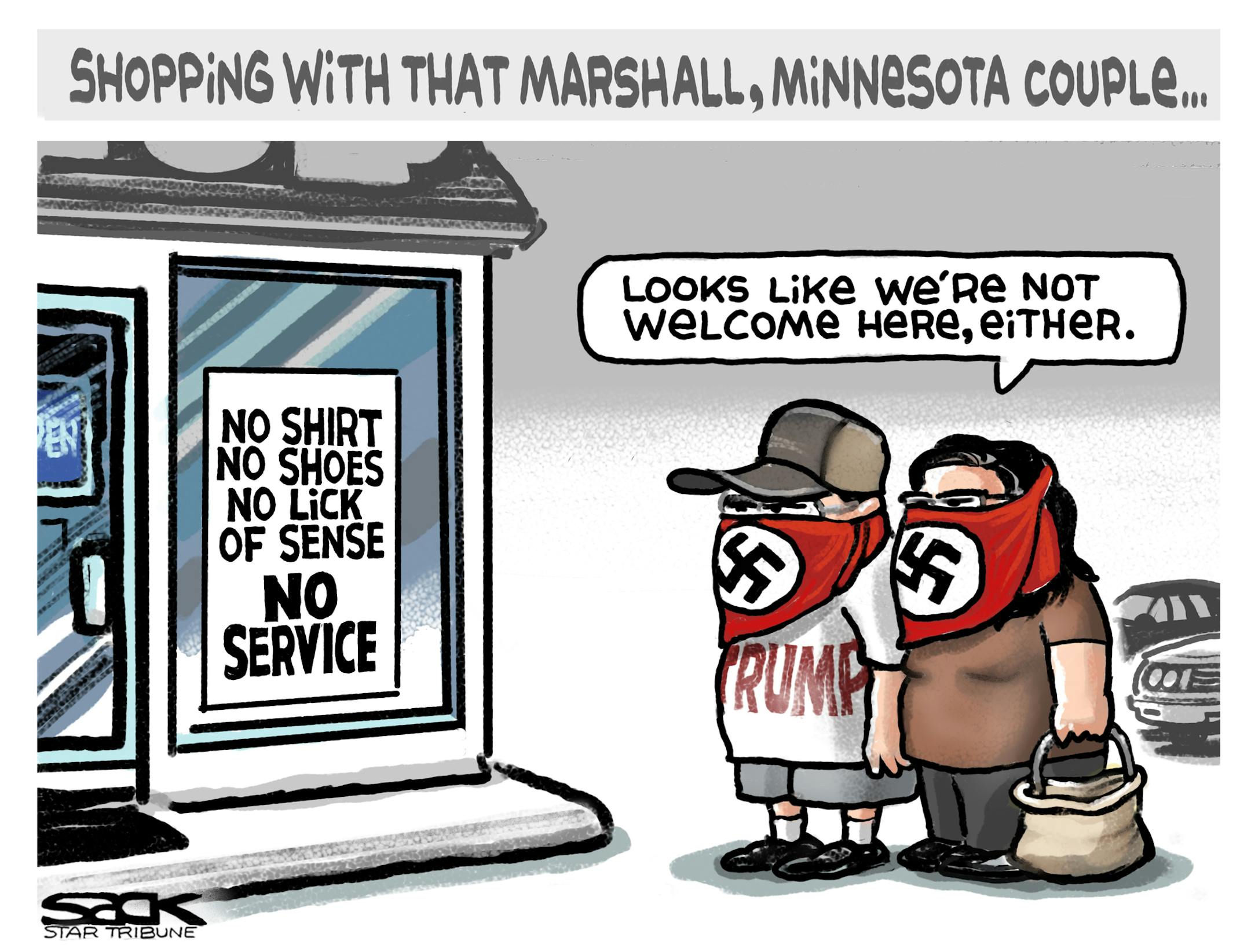 Sack cartoon: No shirt, no shoes ...