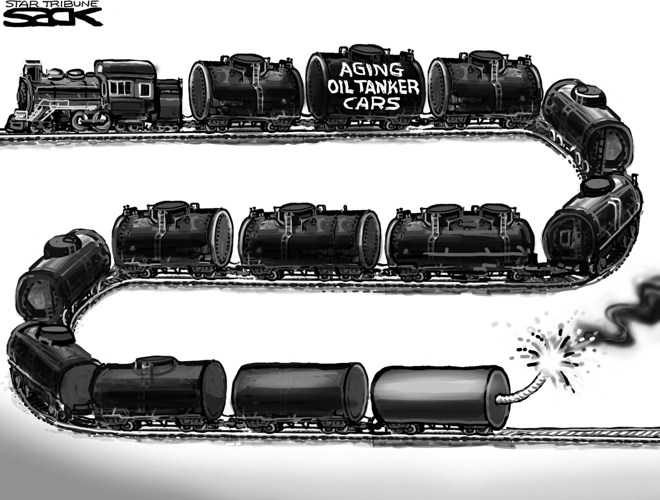 Sack cartoon: Oil trains