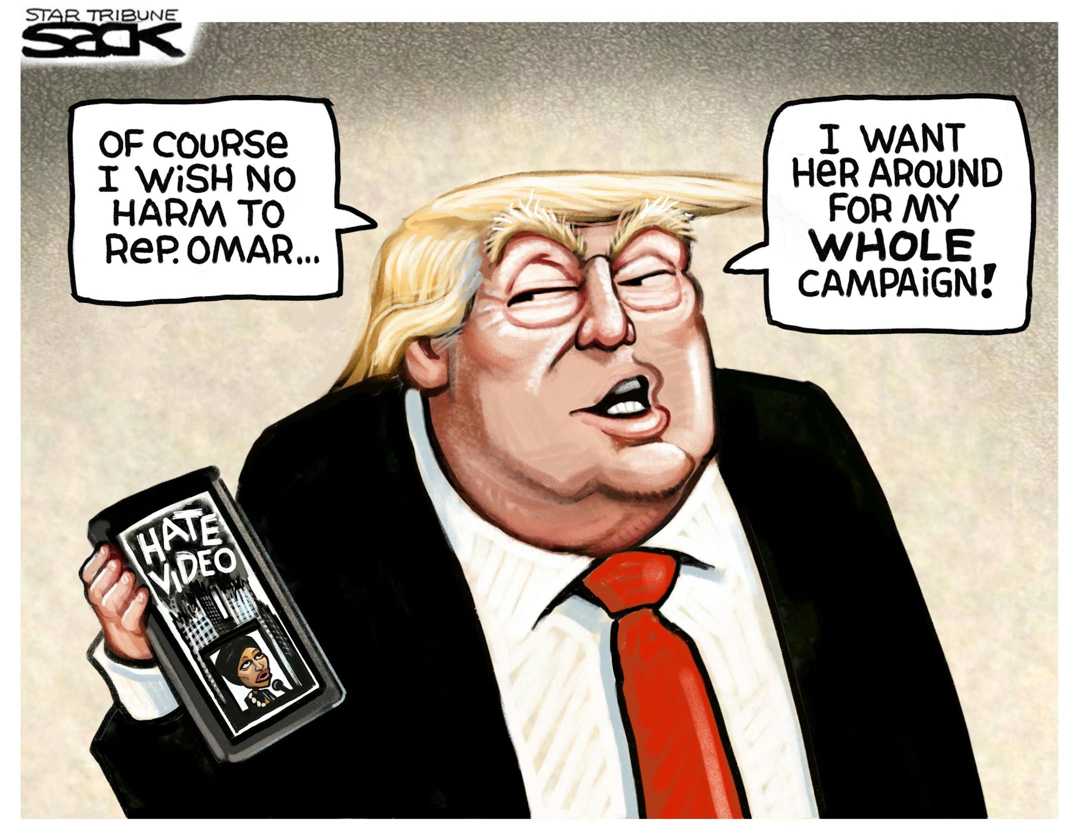 Sack cartoon: President Donald Trump and U.S. Rep. Ilhan Omar