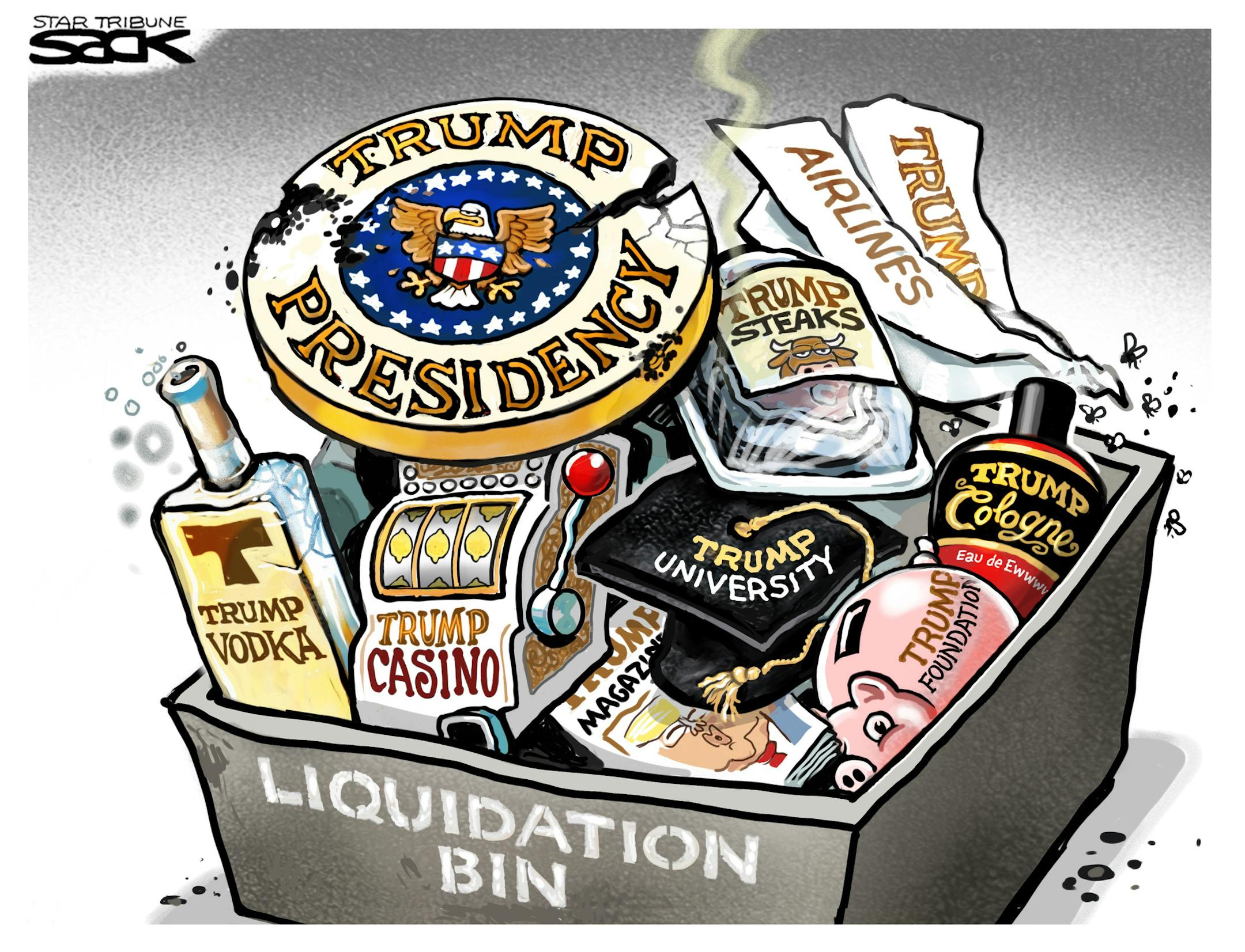 Sack cartoon: Trump's liquidation bin