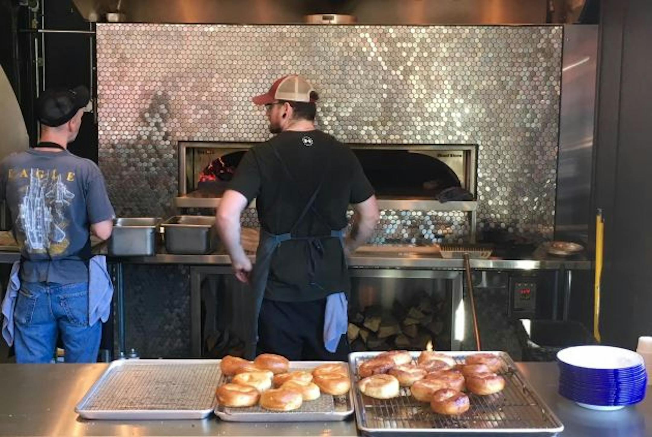 Eaton and his crew bake their dense, chewy, deeply golden, hand-formed bagels on planks in Liza's intense heat, starting them on the left – close to that burning oak – and, as they bake, sliding them to the right.