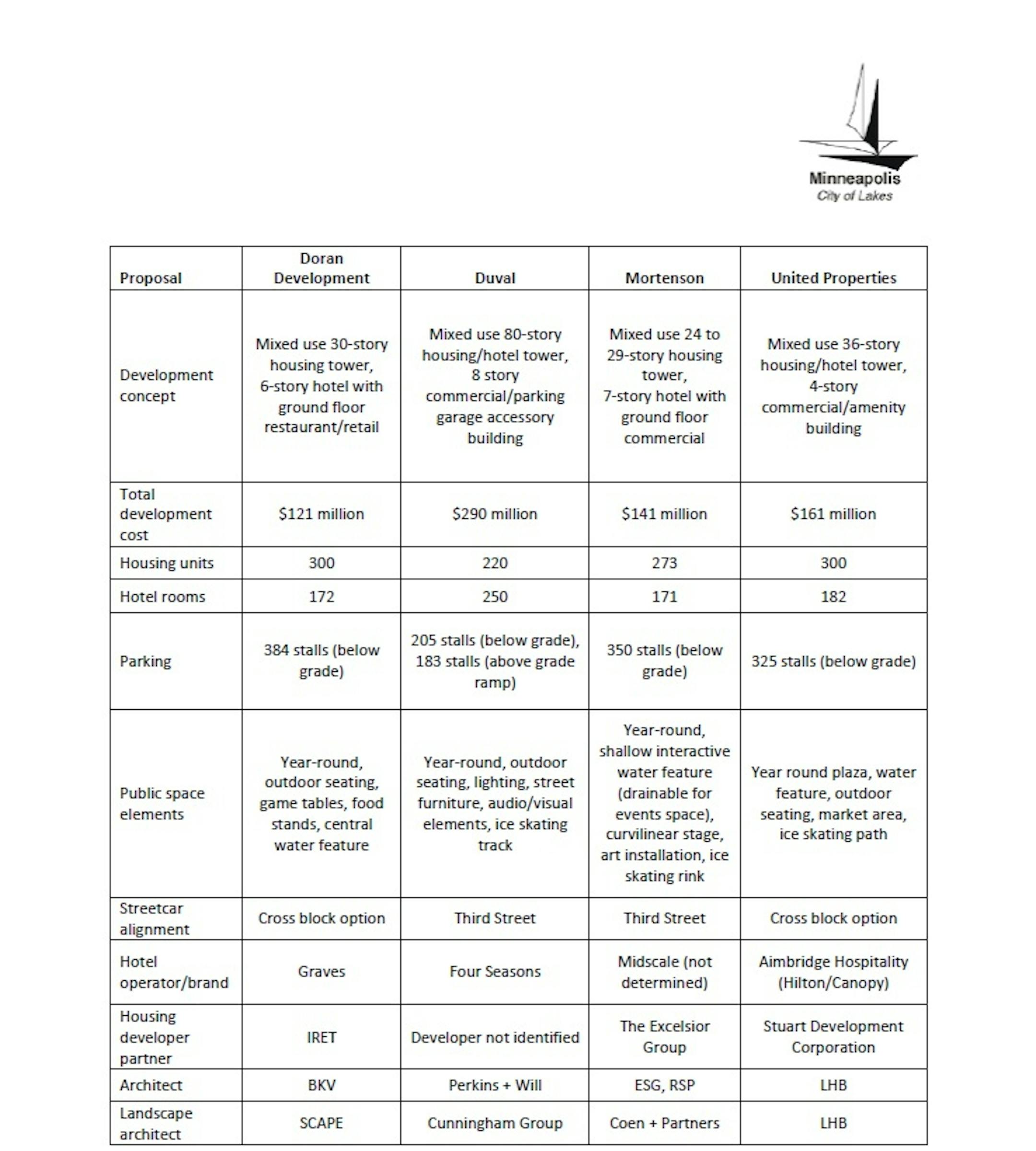 City staff said it chose United over M.A. Mortenson, Duval Development and Doran Cos., all Twin Cities-based firms, because it "best met the city's development goals for the property". Design is subjective to opinion and so the city focused on pragmatics, such as dollar figures. For that, the city said its decision was based on two factors: the sale price and development costs that will put more money in the city's pocket.