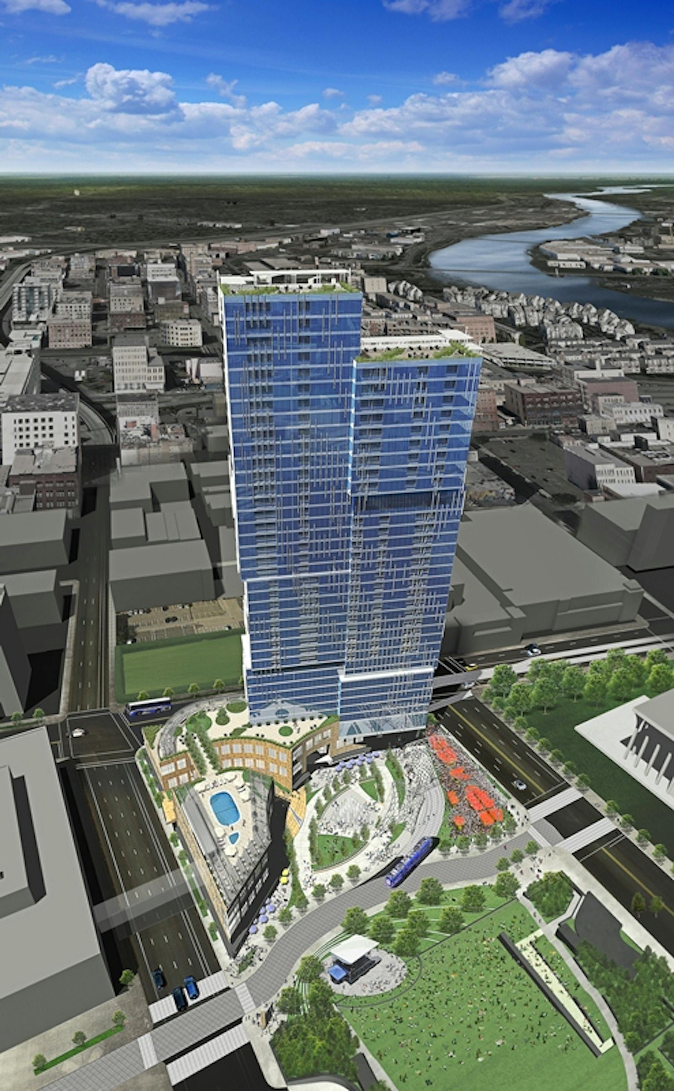 United plans to build a mixed-use project composed of a 36-story tower for residential and hotel rooms and a four-story building for retail, restaurant and other commercial uses. The public park space will take up about half of the parcel.