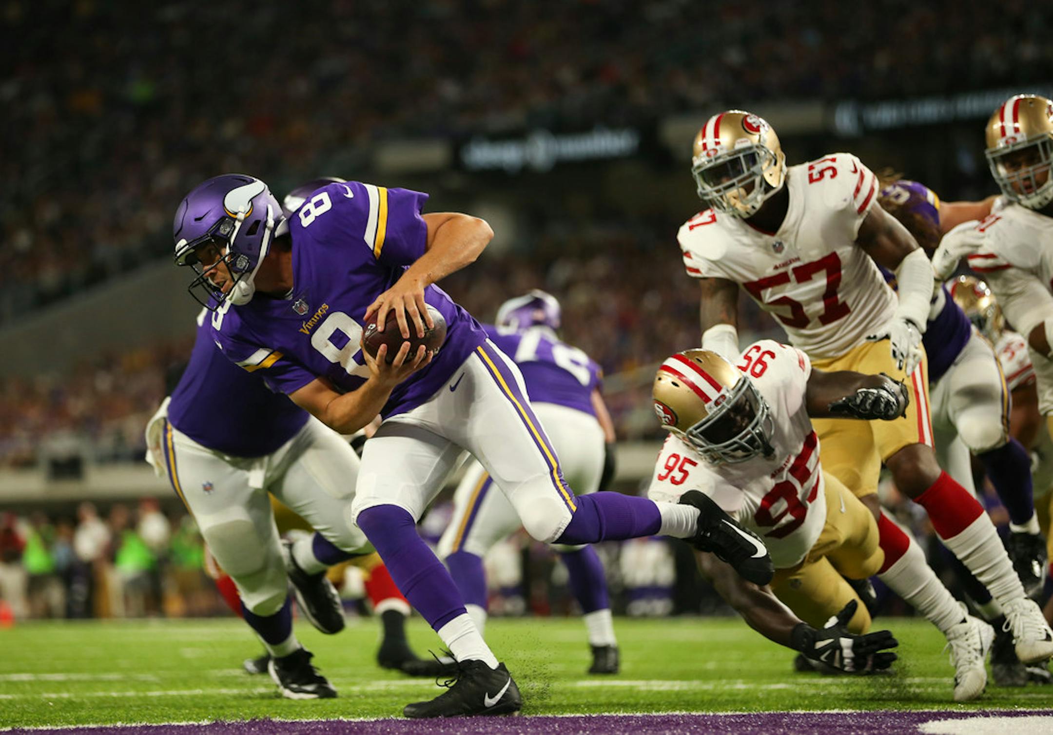 Sam Bradford wasn't there, but Sunday night's first half reminded a Vikings follower or two of the 2015 debacle at Levi's Stadium, when quarterback Teddy Bridgewater was sacked five times in a convincing loss to start the regular season.