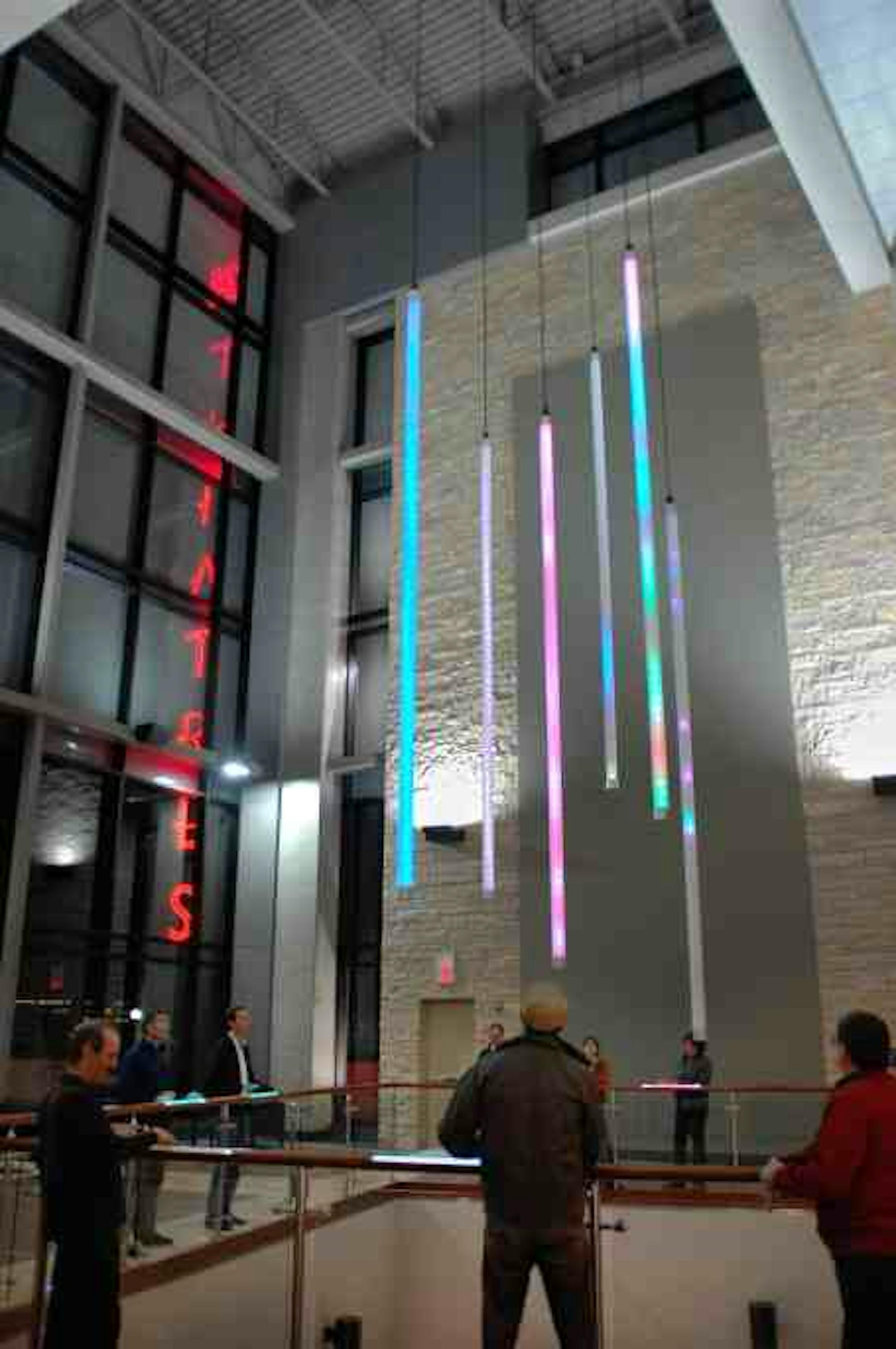 San Francisco artist Camille Utterback will be in St. Louis Park on Jan. 11 for the official dedication of her interactive light sculpture, "Aurora Organ." The piece consists of six long light tubes dangling from the ceiling of the 80 ft. atrium of the Showplace Theaters in a new mall, The Shops at West End. "Aurora" consists of full color RGB LED lights that are activated by touch sensors controlled by custom-designed software. The sensors are inset into the wooden railing of the theater's grand staircase. When visitors tap or touch them, a band of color ripples through one of the light columns. Colors move faster or slower, up or down, depending on how visitors touch the railing — taps produce short bursts of color; holding creates a long streak of color. New colors blend and overlap older patterns.