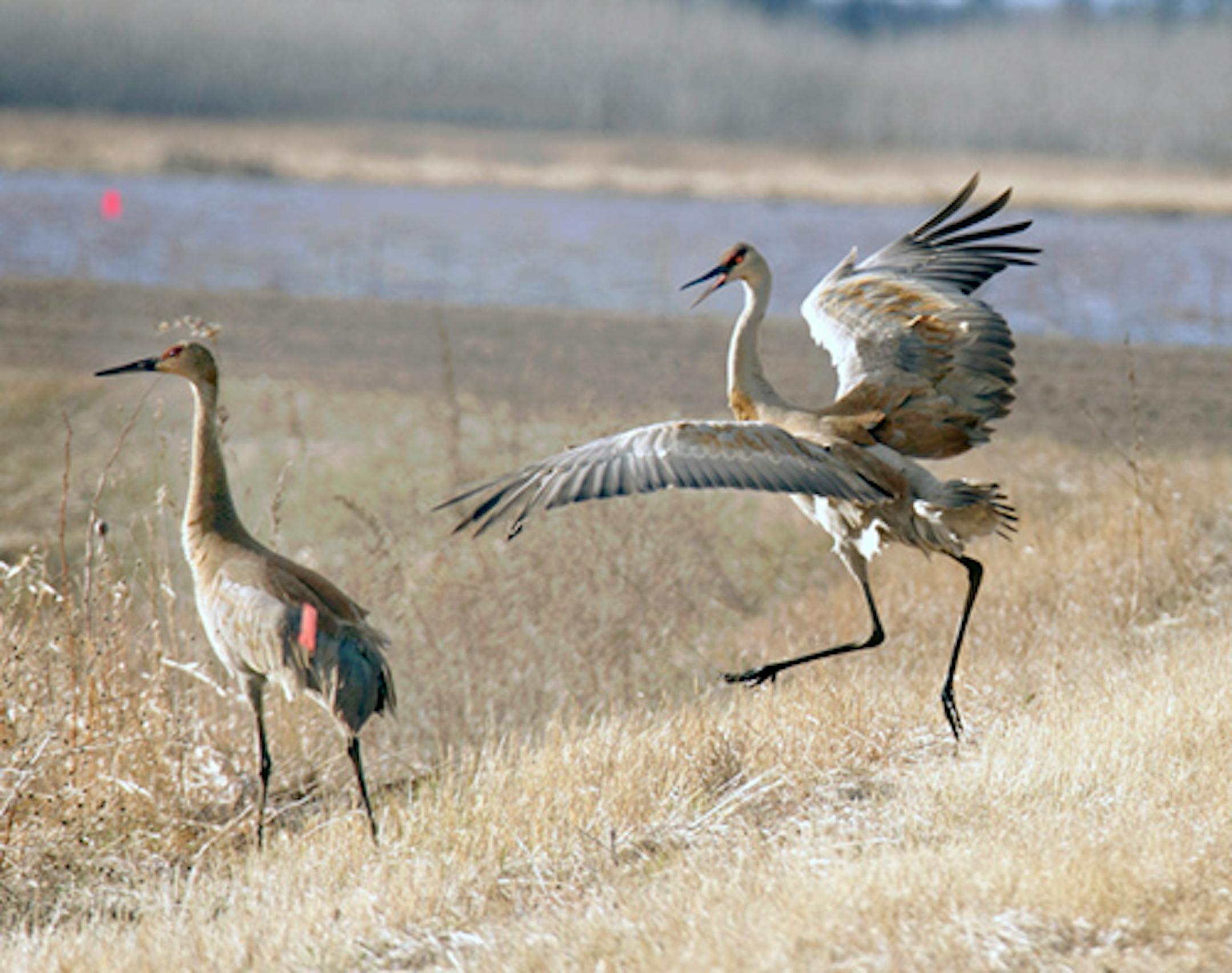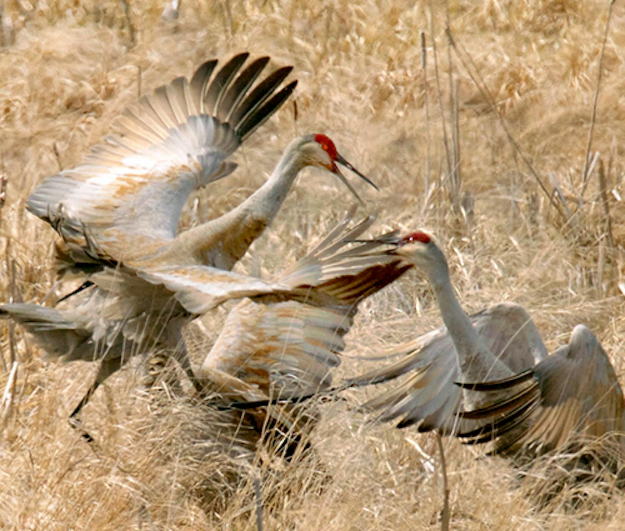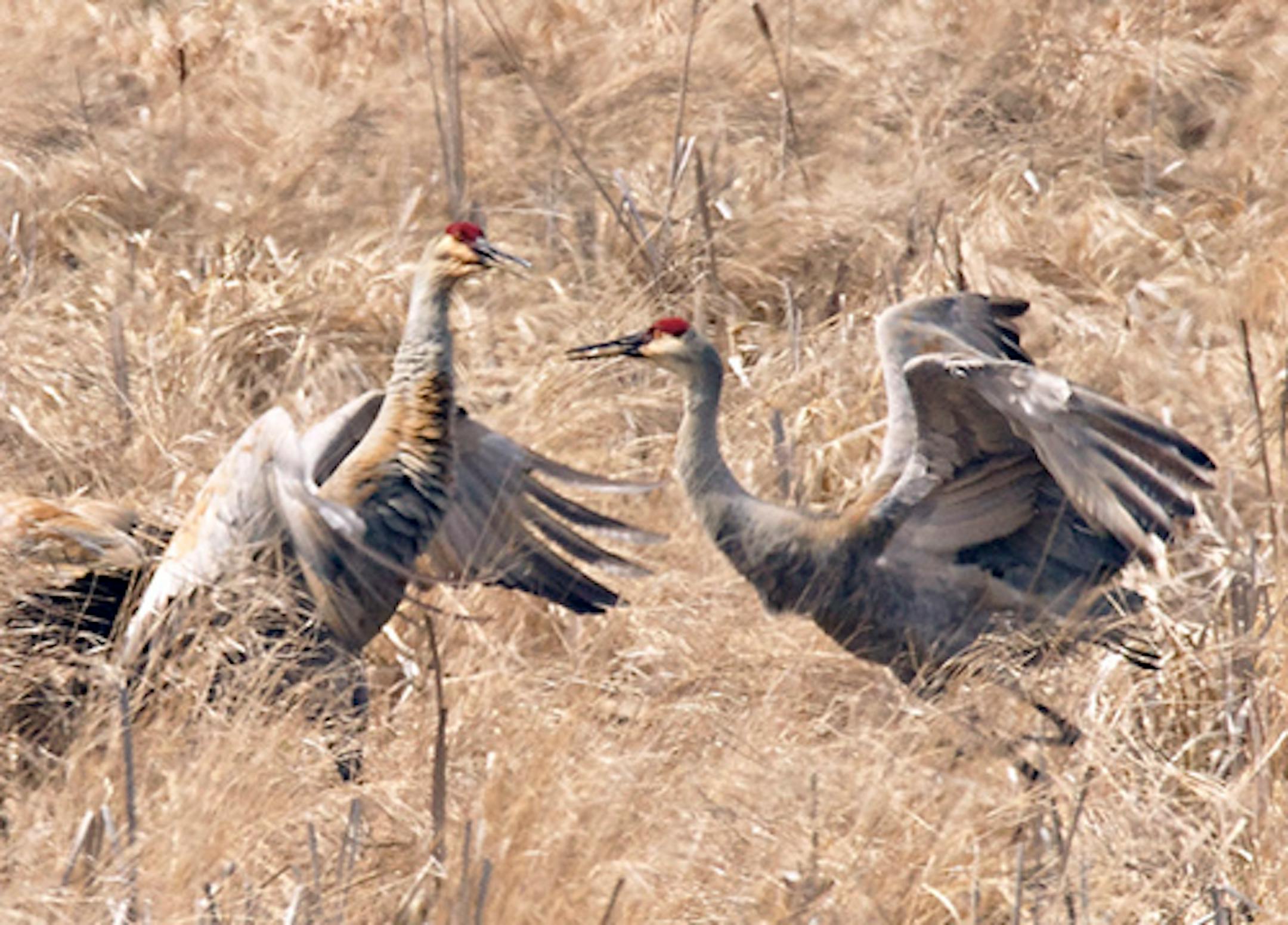 A recent visit to Crex Meadows wildlife area at Grantsburg, Wisconsin, offered excellent looks at Sandhill Cranes doing their courtship dances. These birds were seen in a wet meadow along Phantom Lake Road.
