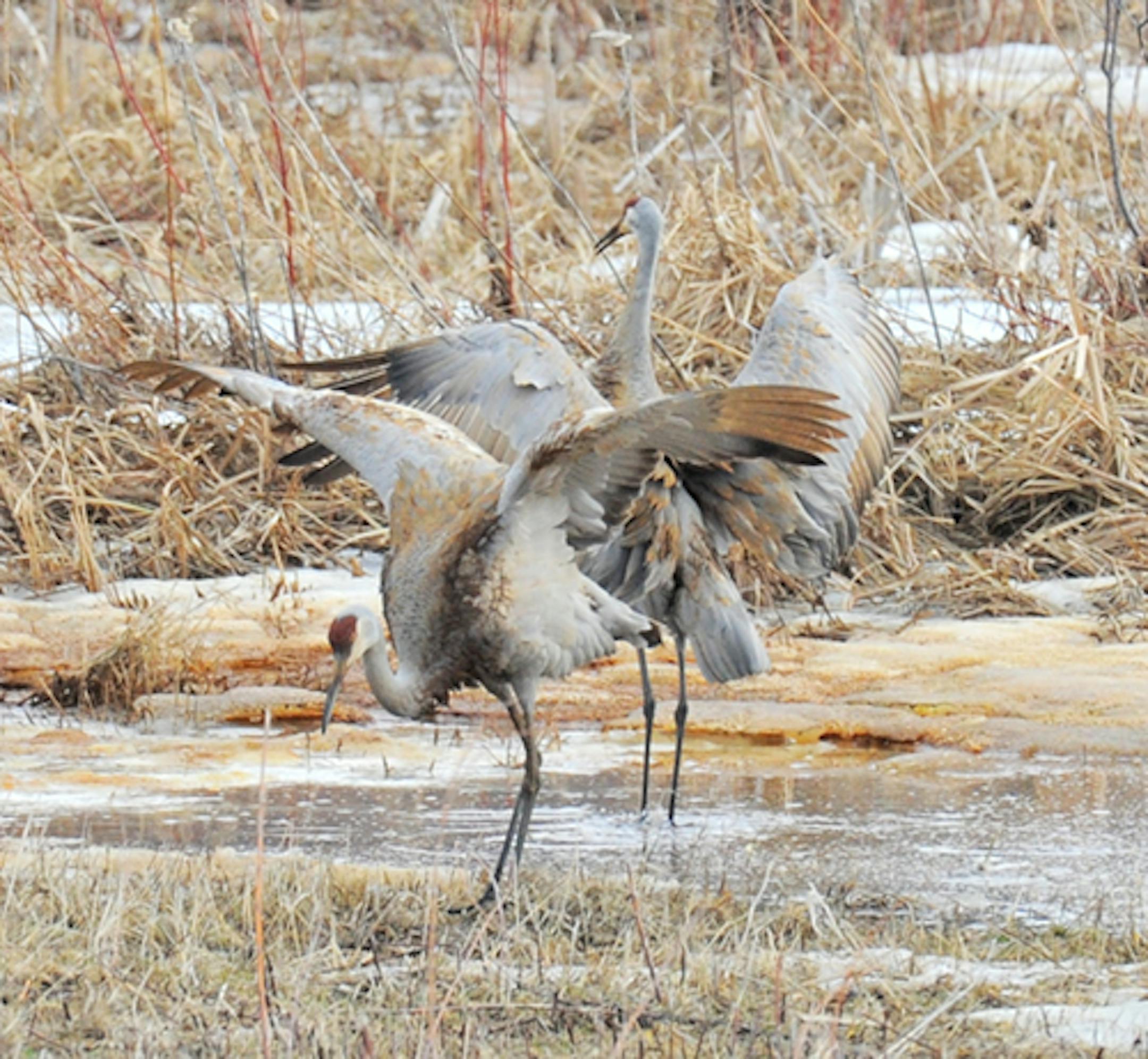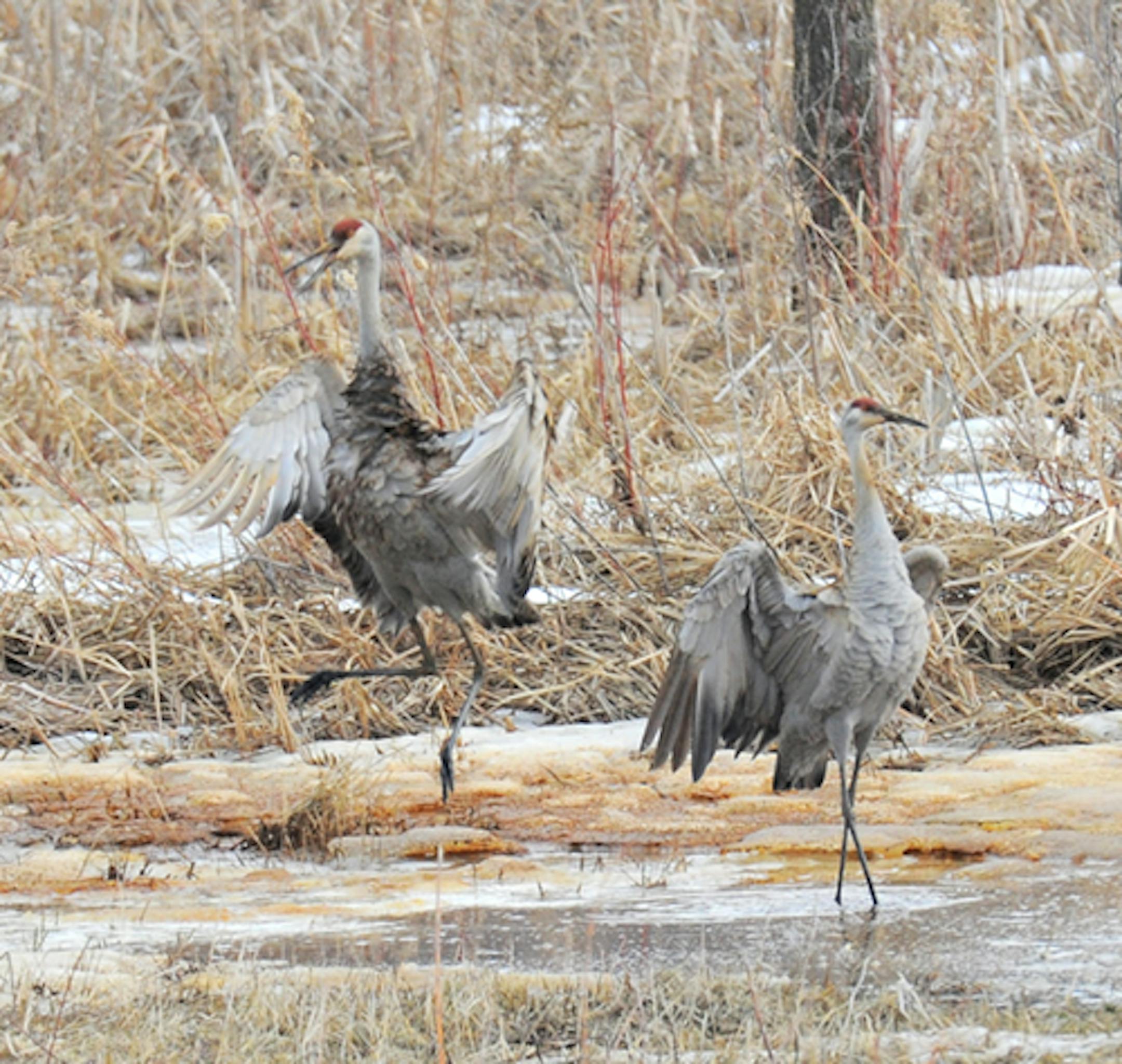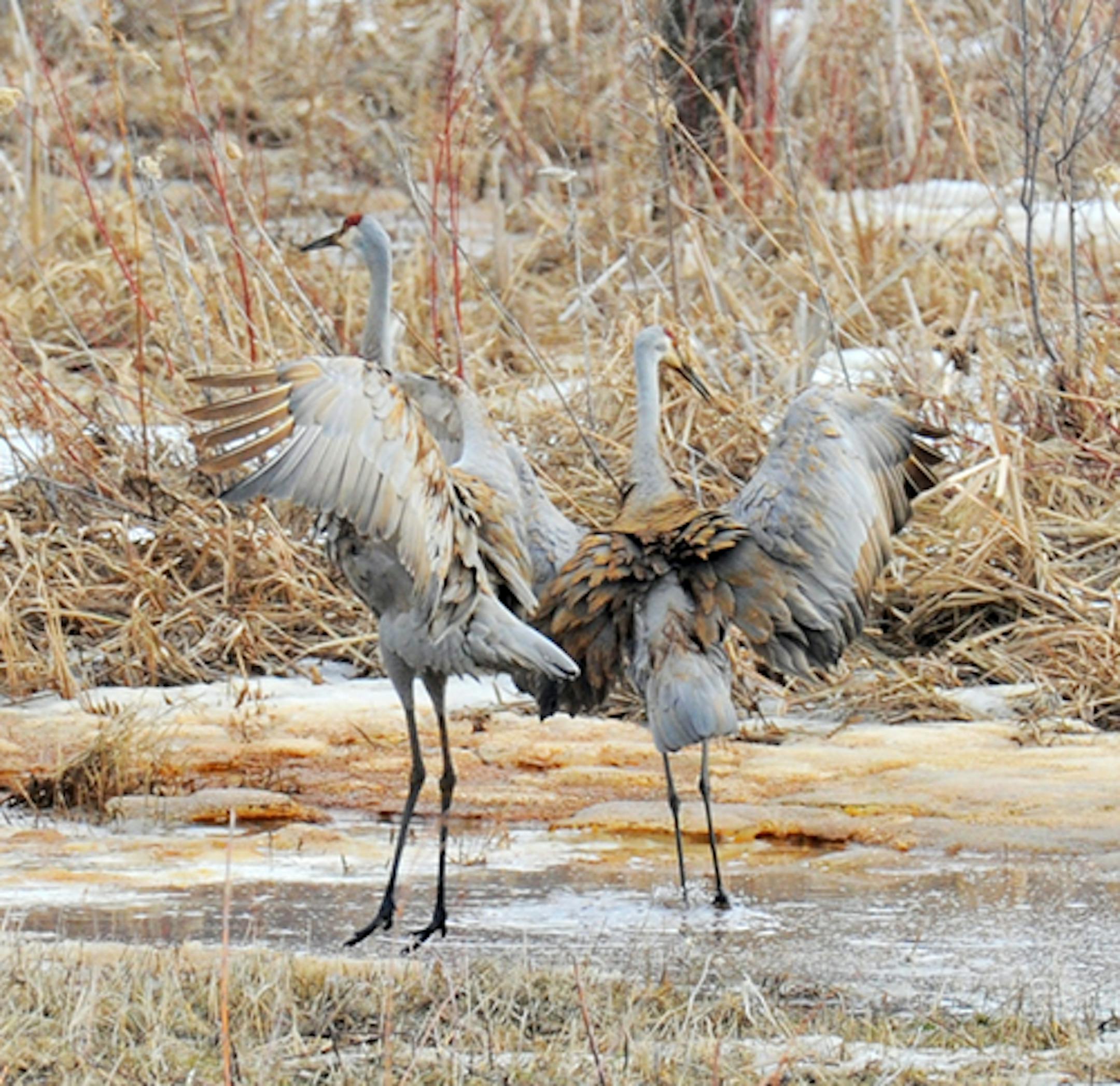 The Sandhill Crane pair being seen west of our home in Orono was dancing yesterday. I watched them for a couple of hours, and got to see two brief dancing bouts. A neighbor told me they nested at this location last year, producing one colt. It disappeared after a week, probable coyote victim. I've heard of nesting in other years, but never have seen the birds after early spring. I intend to be more observant.