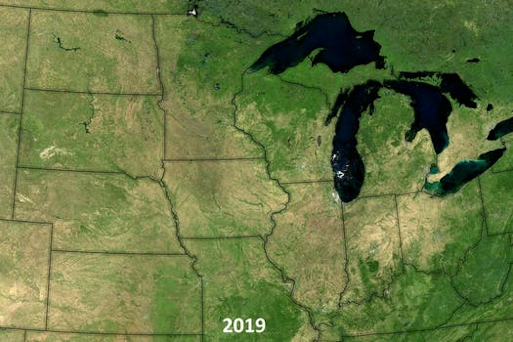 At this time of year, a band of deep Kelly green should spread from Ohio to North Dakota as corn and soybeans race to pack on size before they pollinate and bear fruit. But 2019's unprecedented rains have uprooted the typical course of events. Some crops are waterlogged and stunted. Others won't be planted at all.