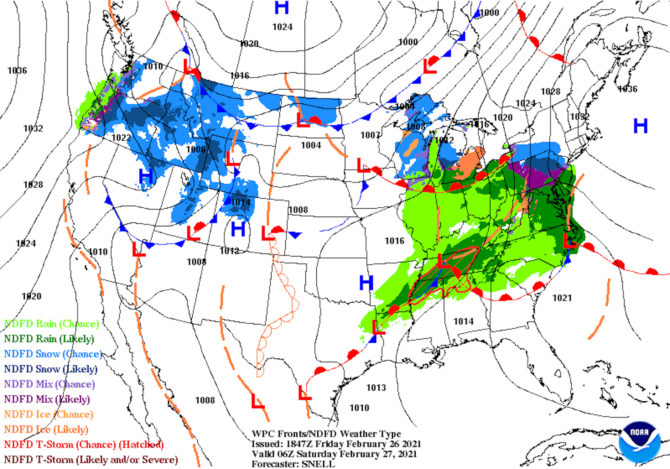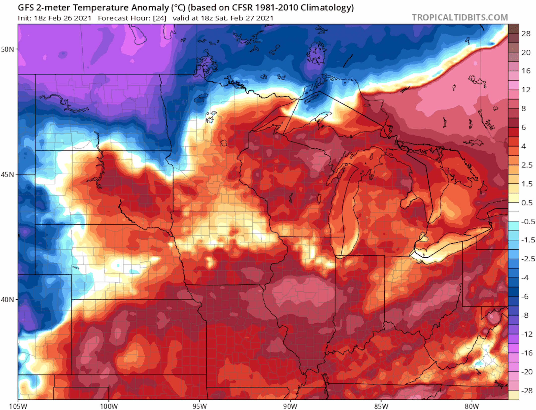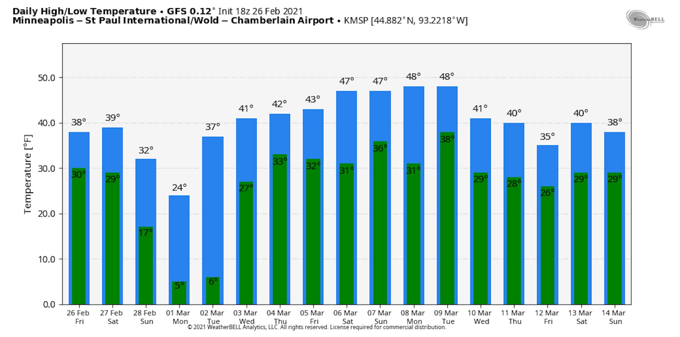 Believe it or not, this is the last weekend of February 2021 and the last weekend of Meteorological Winter. With that being said, the coldest 3 months of the year (on average) for the northern hemisphere will be behind us. Monday, March 1st is the first day of Meteorological Spring. The weekend ahead definitely looks milder than it was during the 1st half of the month. Saturday will be the warmest day of the weekend with the high in the metro around 40F. Snow develops Saturday night with 1" to 2" possible through AM Sunday. Temps on Sunday will tumble into the 20s with a cooler breeze.