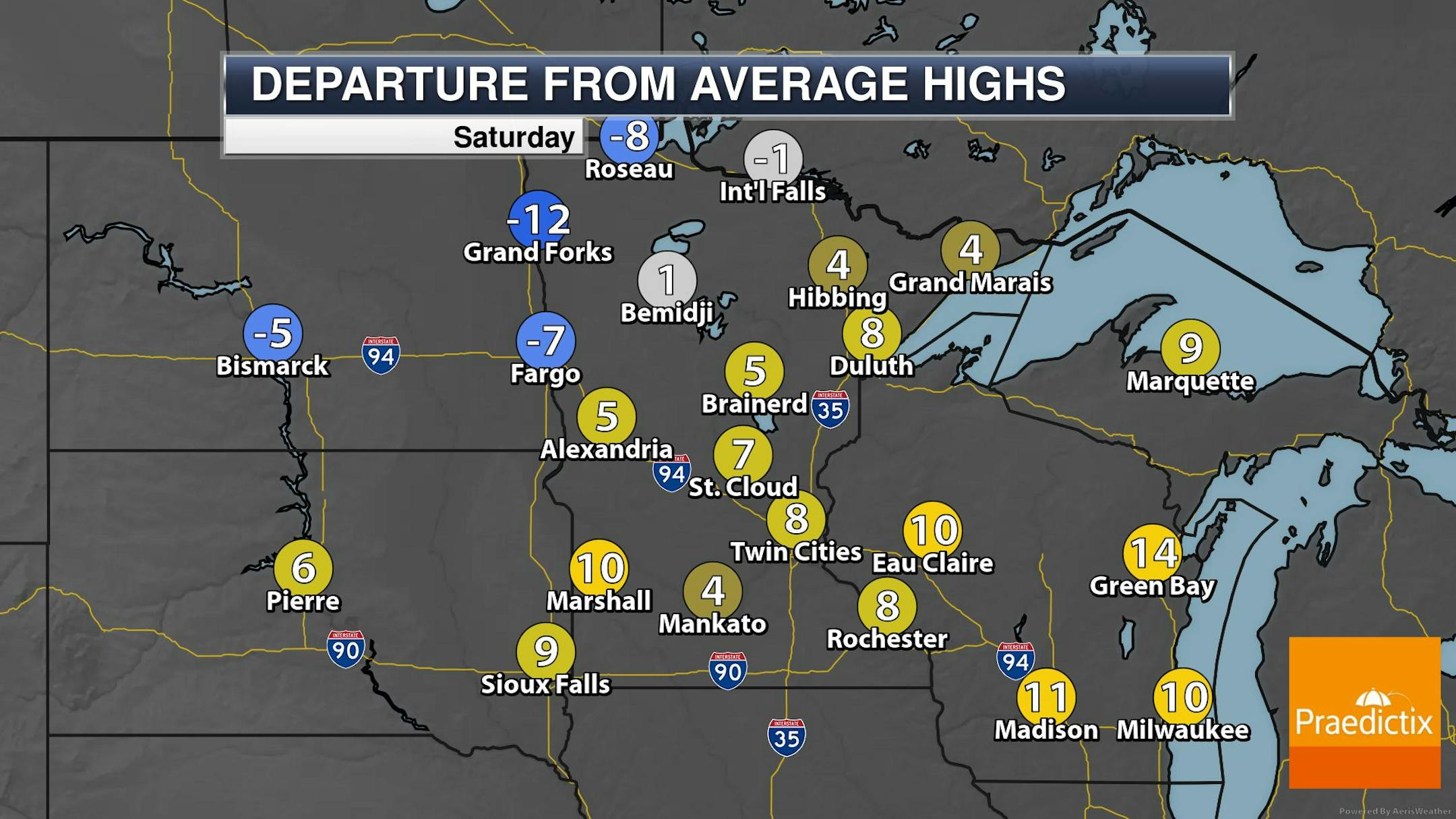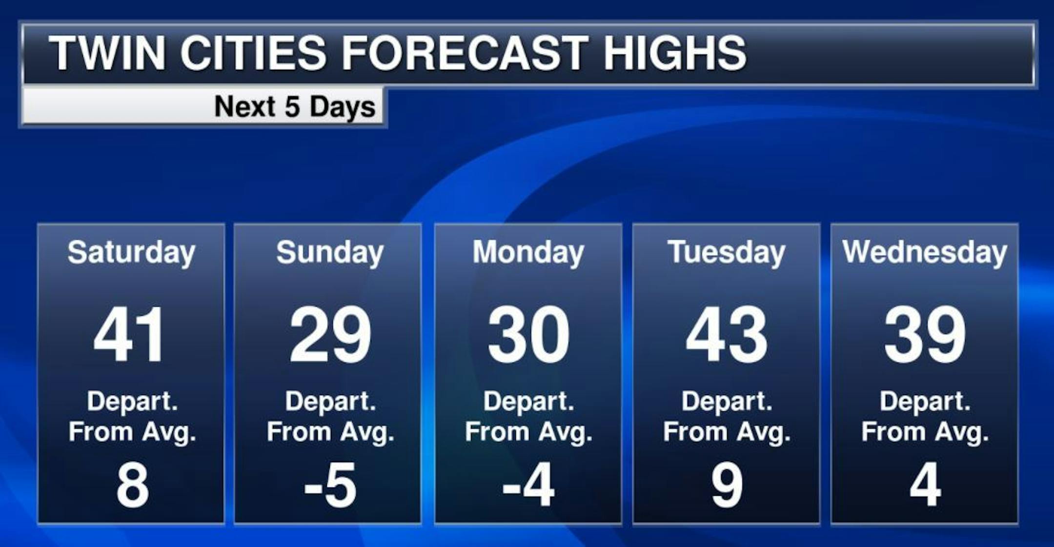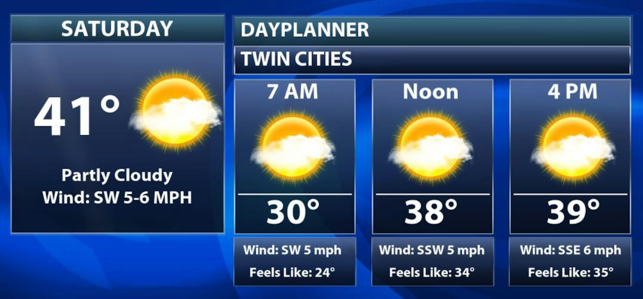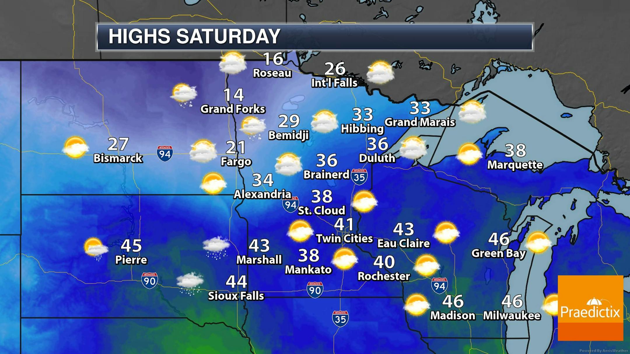 The weather outlook for Saturday shows fairly quiet conditions through much of the day. The nice thing is that winds will be quite a bit lighter than they were on Friday. The highest wind gust in the Twin Cities on Friday was 43mph, while the highest wind gust in St. Cloud was 52mph! Temps will be slightly warmer than average on Saturday with highs warming into the lower 40s.