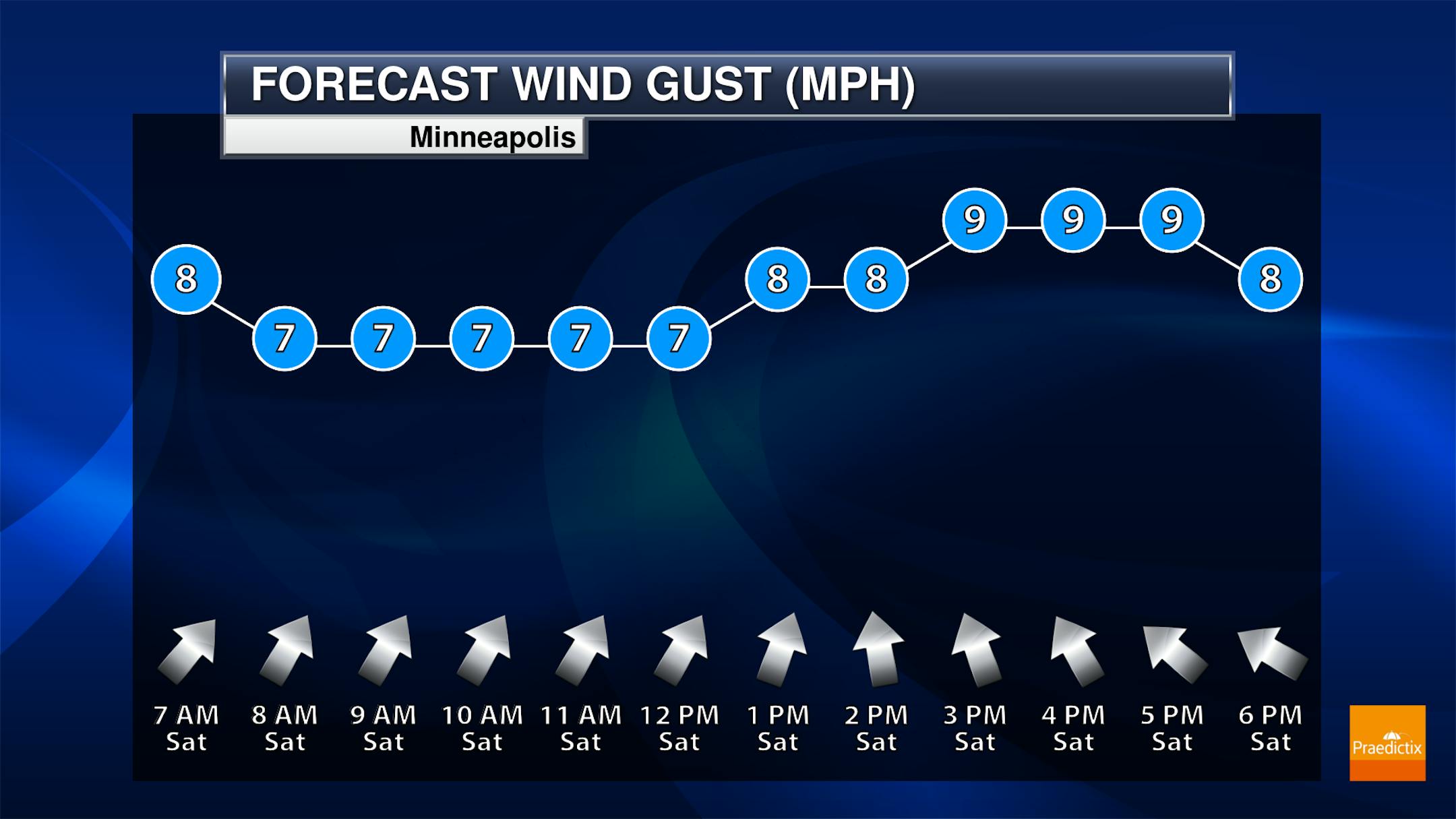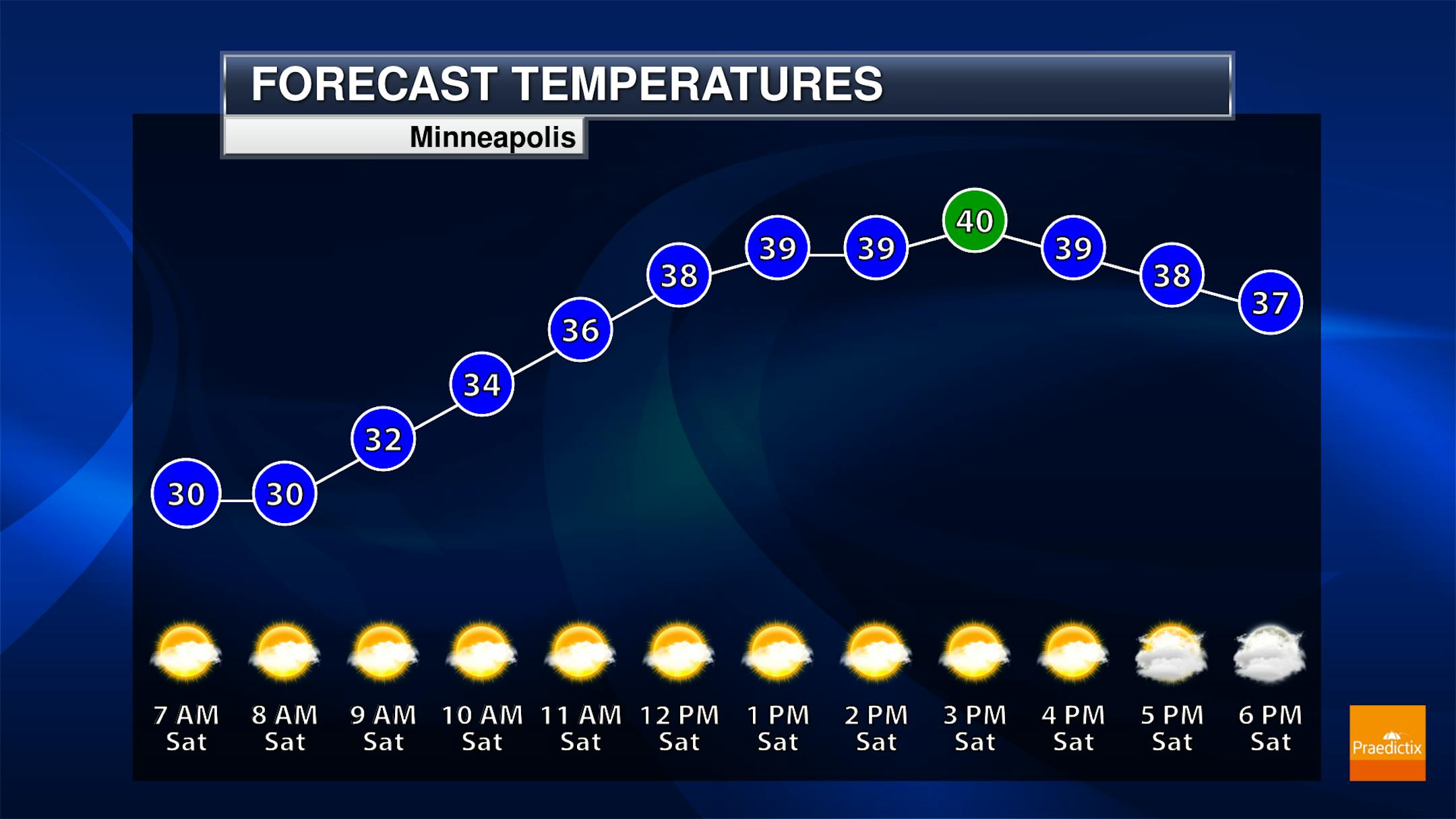 The meteograms for Minneapolis on Saturday shows temps warming from the lower 30s in the morning to near 40F by the afternoon. Skies will be a little sunnier to start, but clouds will thicken through the day in advance of our Saturday night snow chance. Winds will be around 5-10mph out of the south and won't be nearly as strong as they were on Friday.