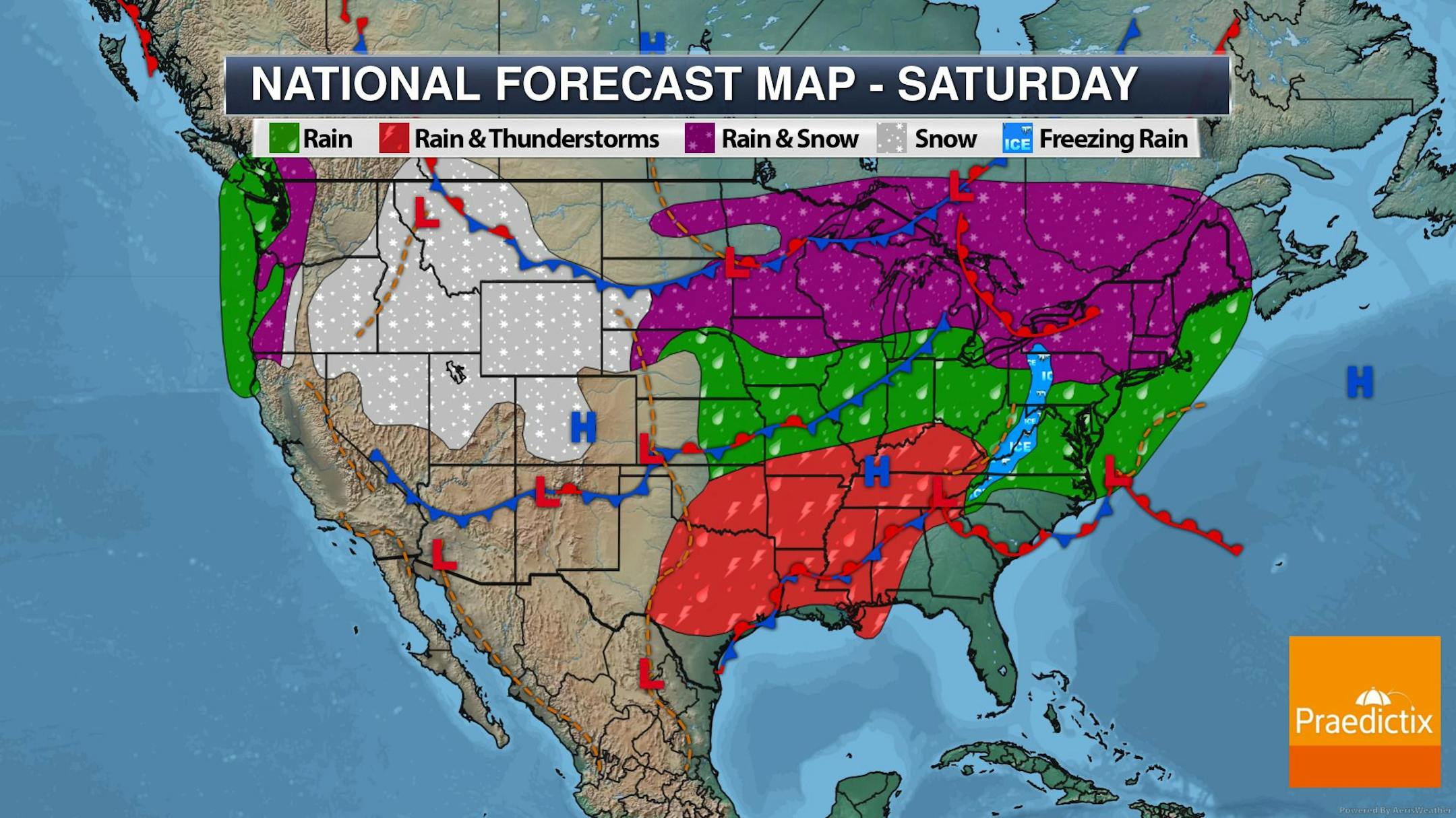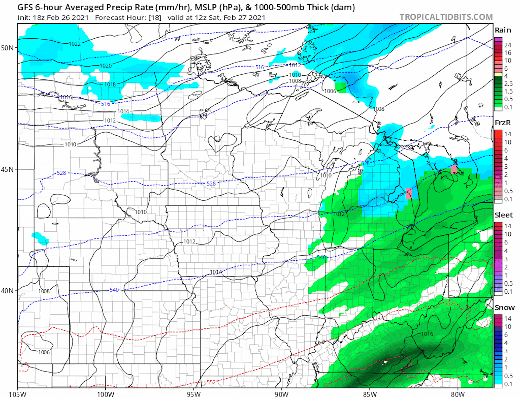 Here's the weather outlook across the region for Saturday, which shows that much of the southern half of the state will warm into the 30s and lower 40s ahead of our light snow chance Saturday night. Also note the cooler air perched to the NW, this is some of the cooler air that will slide in behind the system on Sunday and Monday.