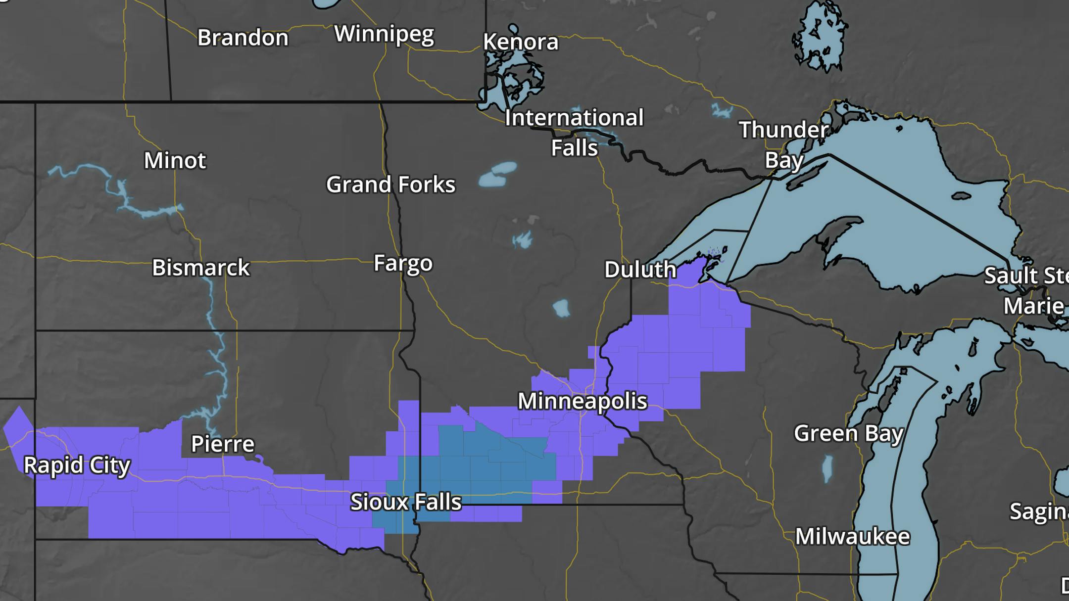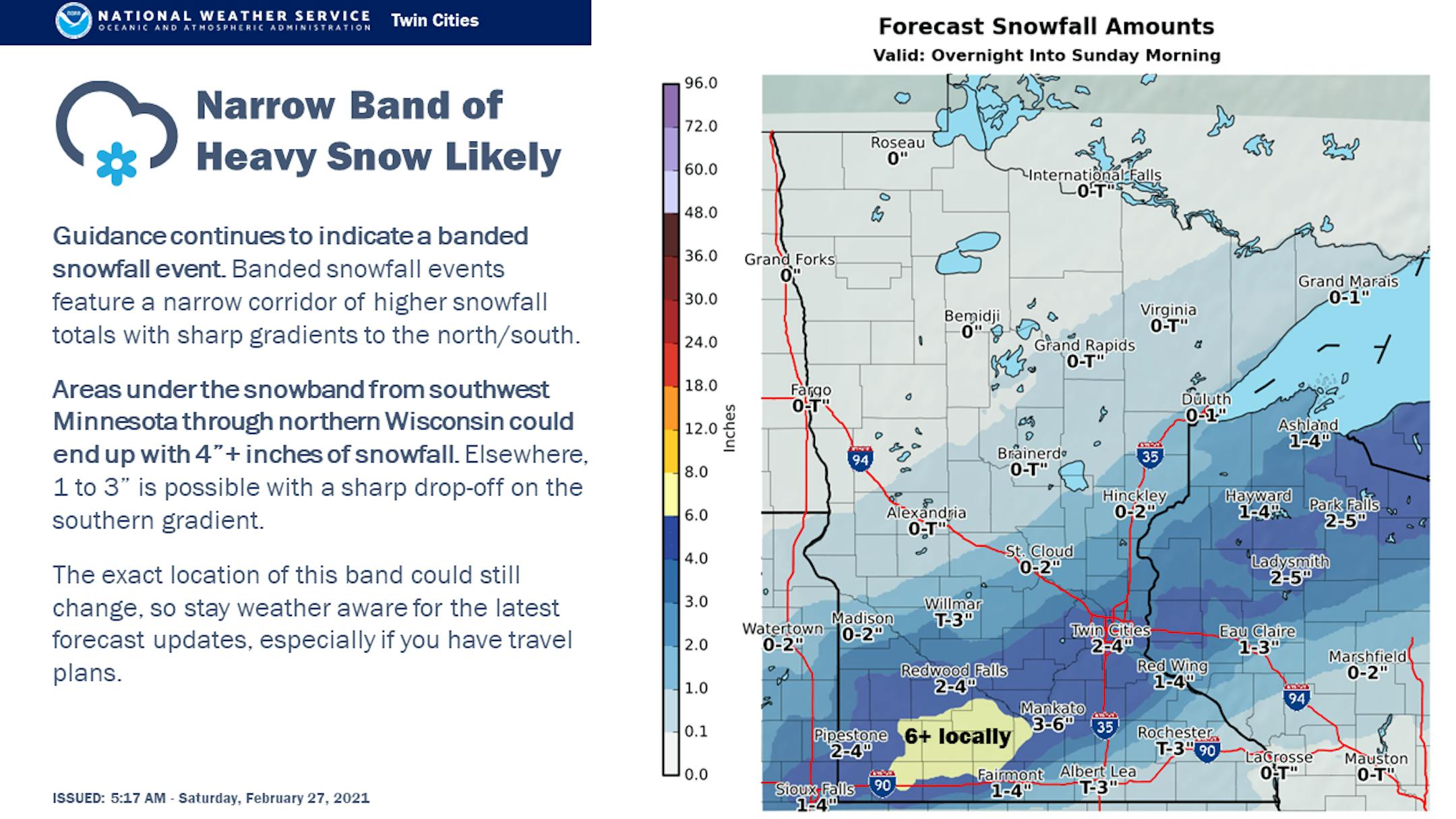 "A band of snow is expected Saturday night into Sunday morning, with 4"+ inches possible from southwest Minnesota through northern Wisconsin. Forecasting the exact location is difficult due to the small area impacted and uncertainties in the set up."