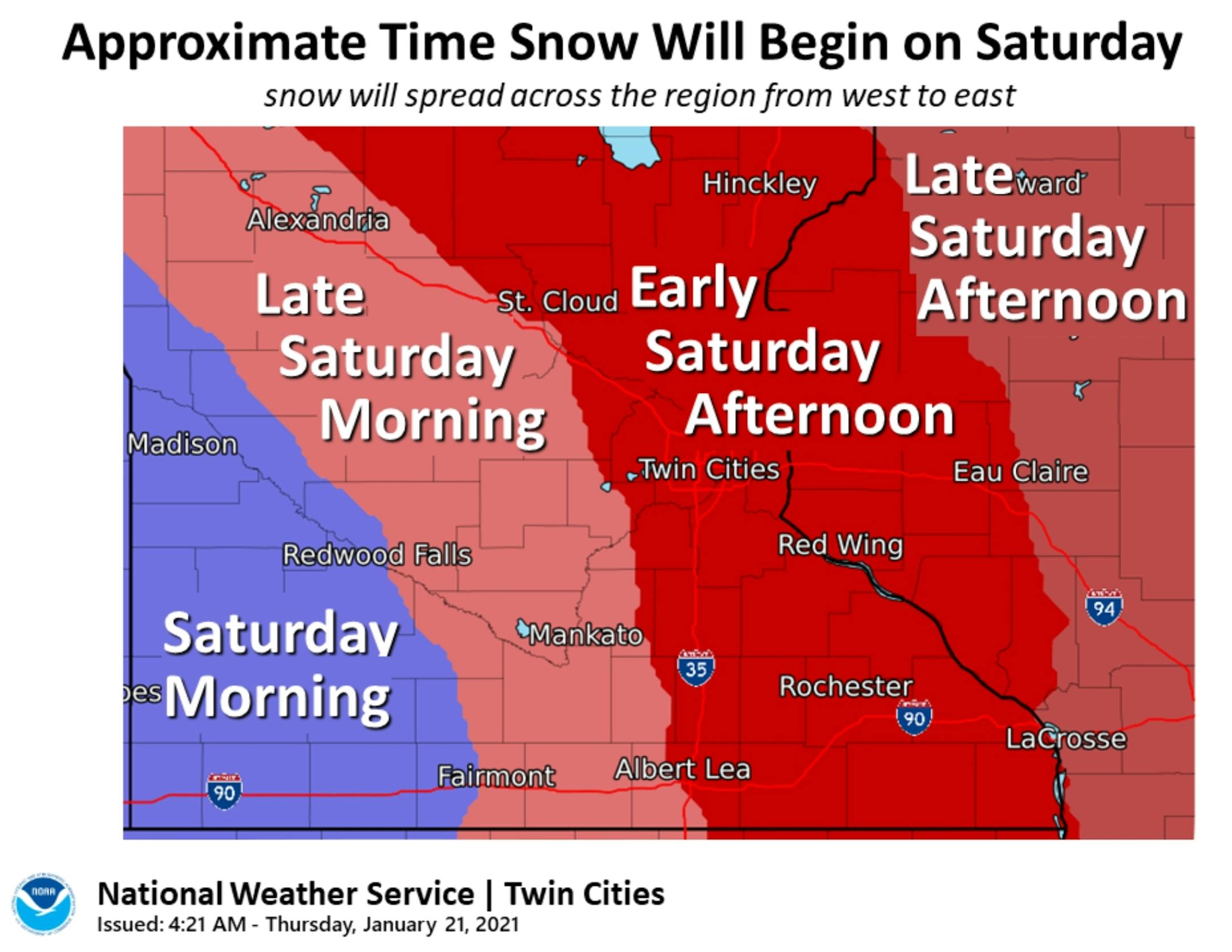 Snow Reaches MSP Metro Midday Saturday. A shield of light snow should spread from west to east across the state - roads may be snow covered and very slick by mid or late afternoon on Saturday.