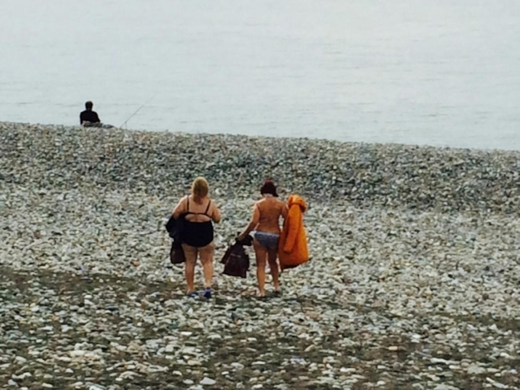 It's a lovely oceanfront, with a new paved walking and biking path, benches and streetlamps. The beach is rocky, with dark sand at the water's edge. A long line of fishermen had set up operations along a berm of the flat, smooth rocks, and on that 60-degree day, they were joined by several swimmers. Here's a picture of a couple of them; note the parka being carried by the one on the right.