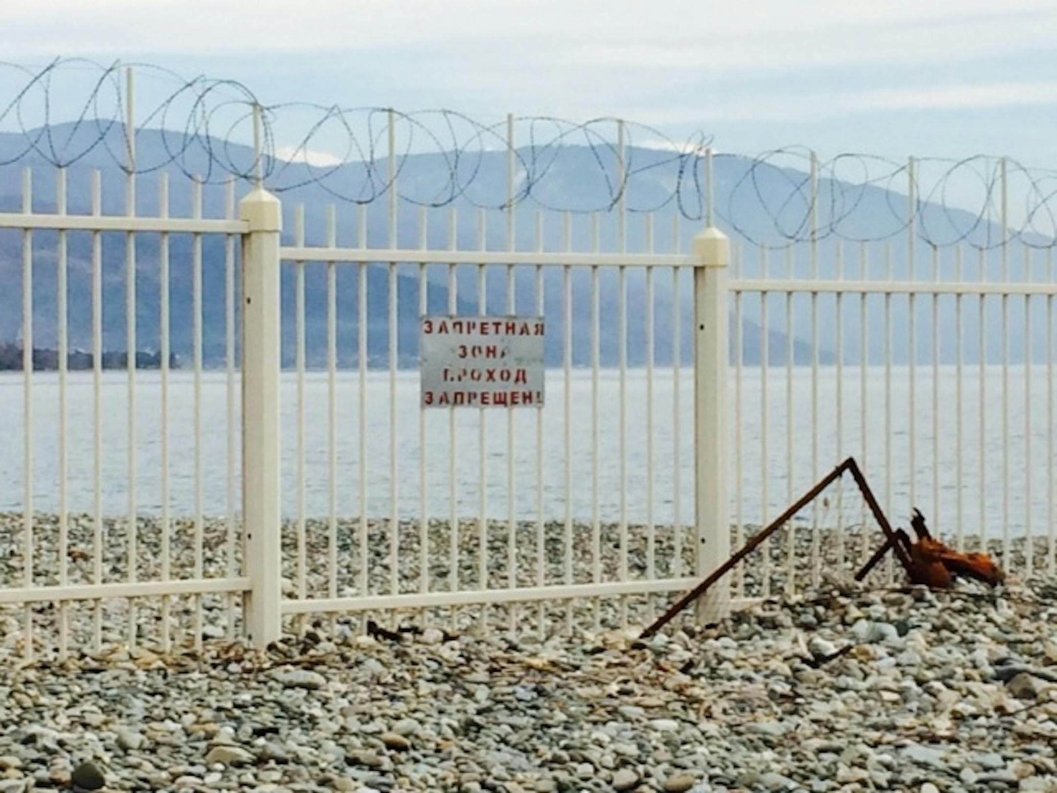 One surprising find: just a short walk down the beach is the closed border between Russia and Abkhazia, a breakaway republic that is part of the country of Georgia. Though Abkhazia has friendly relations with Russia, the security worries surrounding the Sochi Games led Russian officials to tighten security at the border. This is what you run into.