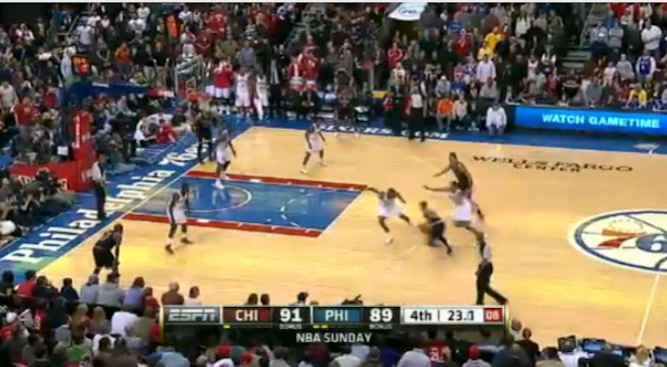 Second screen grab (photo link to video): Derrick Rose encountering a very similar double-team against Philadelphia in Sunday's game, blowing past it and making a tough shot to cement his team's victory. Yes, the Bulls were up by two at the time, but it was still a somewhat similar situation to ...