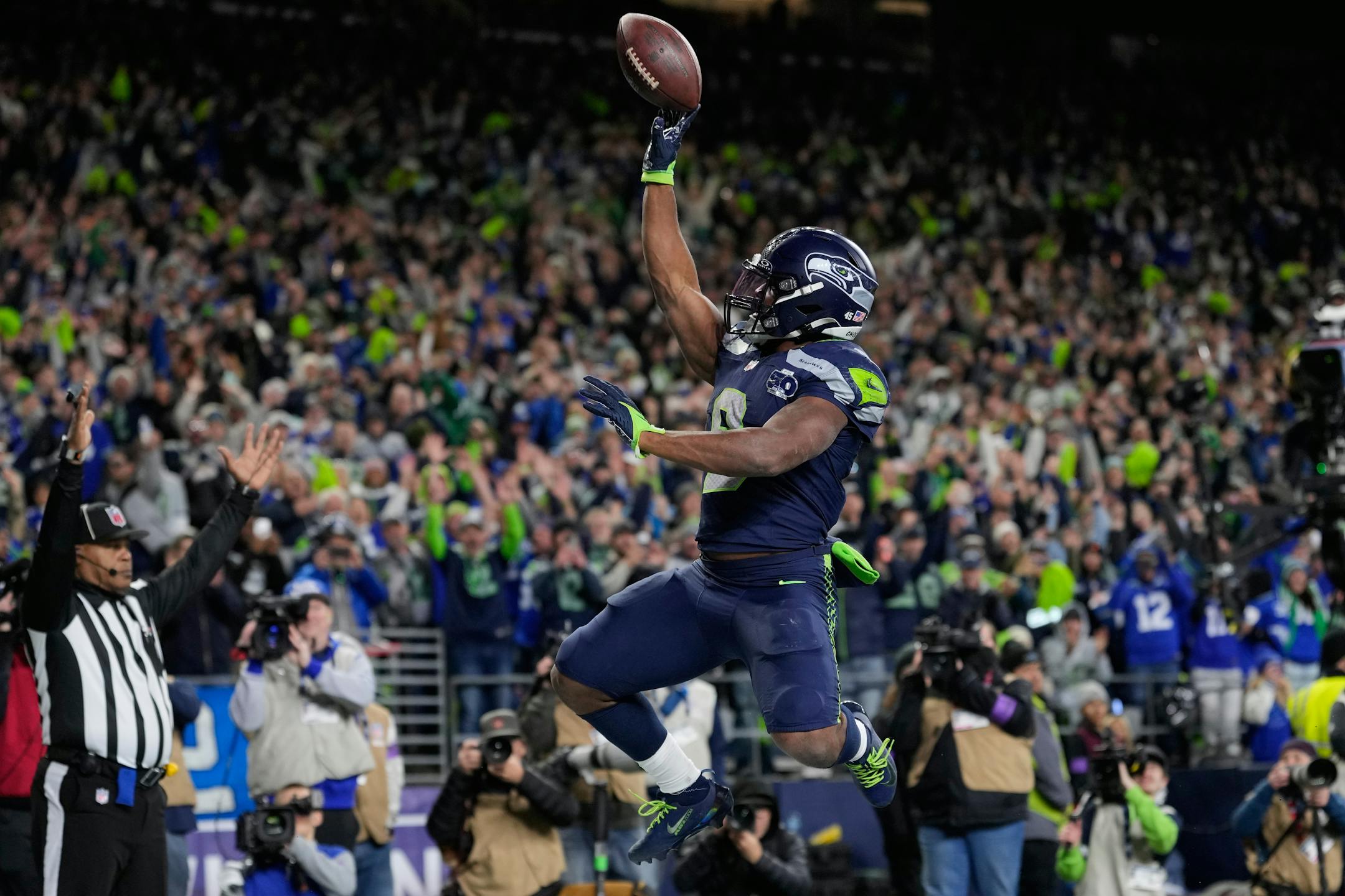 The Seahawks led 7-0 13 seconds into the game thanks to Shaheed, who fielded the opening kick and took it 95 yards to the end zone. It was the fourth kickoff return for a touchdown to open a playoff game since 2000 and the longest postseason kick return in franchise history.