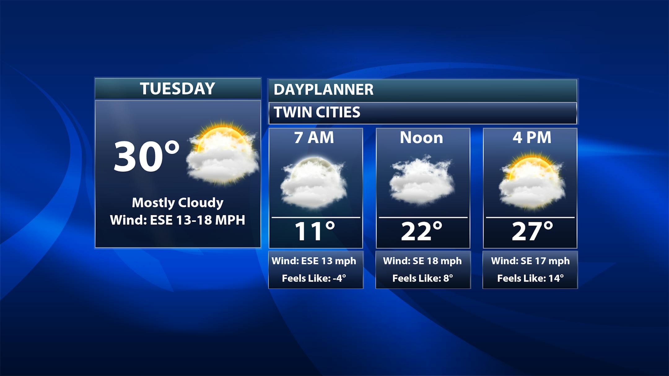 The hourly temps for Minneapolis on Tuesday show temps starting in the teens with highs warming into the upper 20s to near 30F. Skies will be cloudier than they were on Monday with strong southeasterly winds up to 30mph to 35mph.