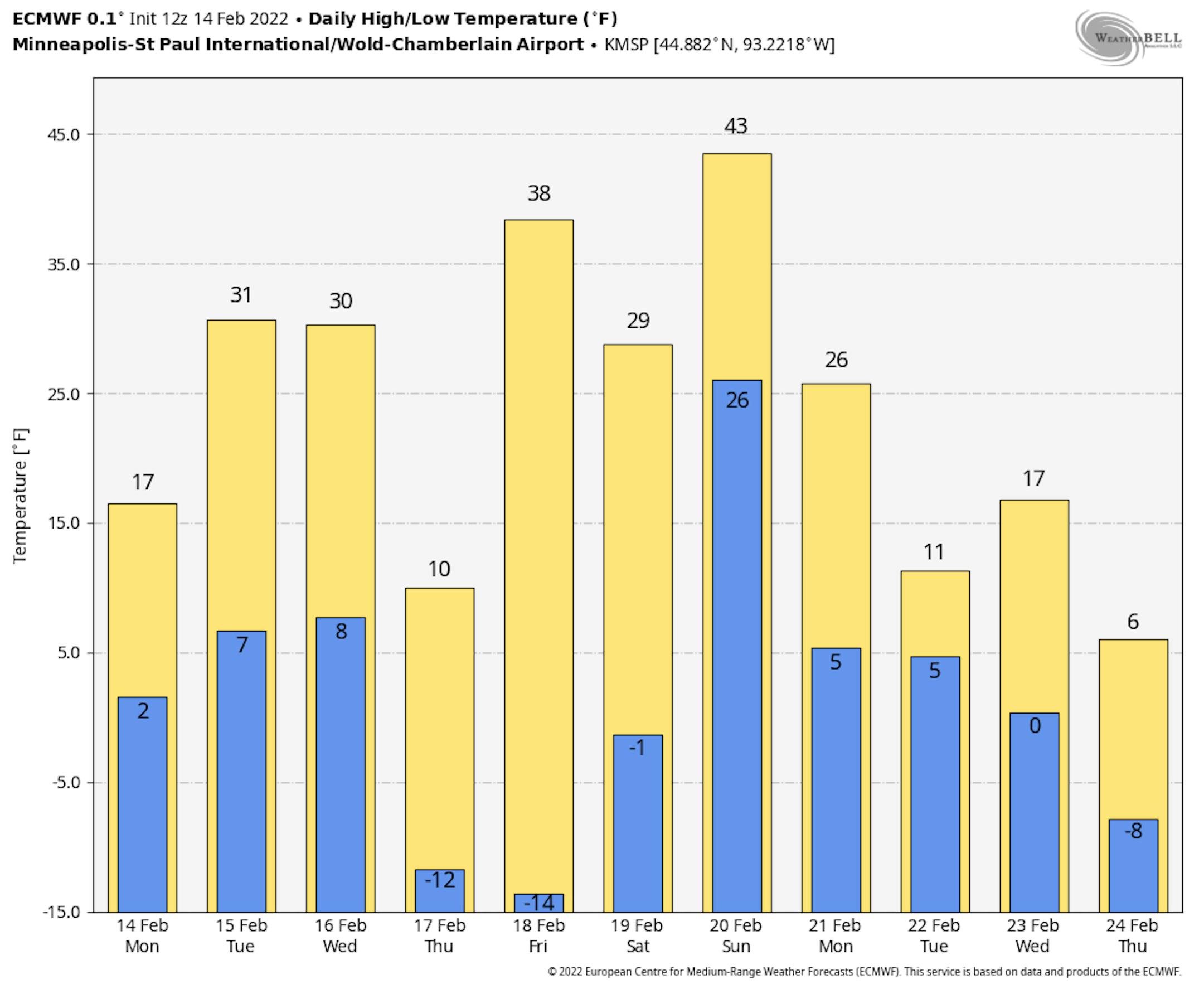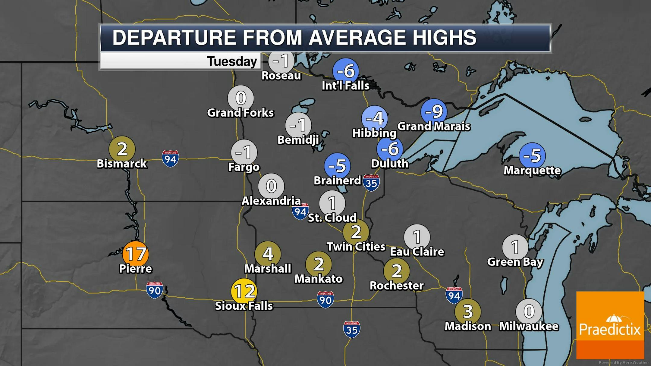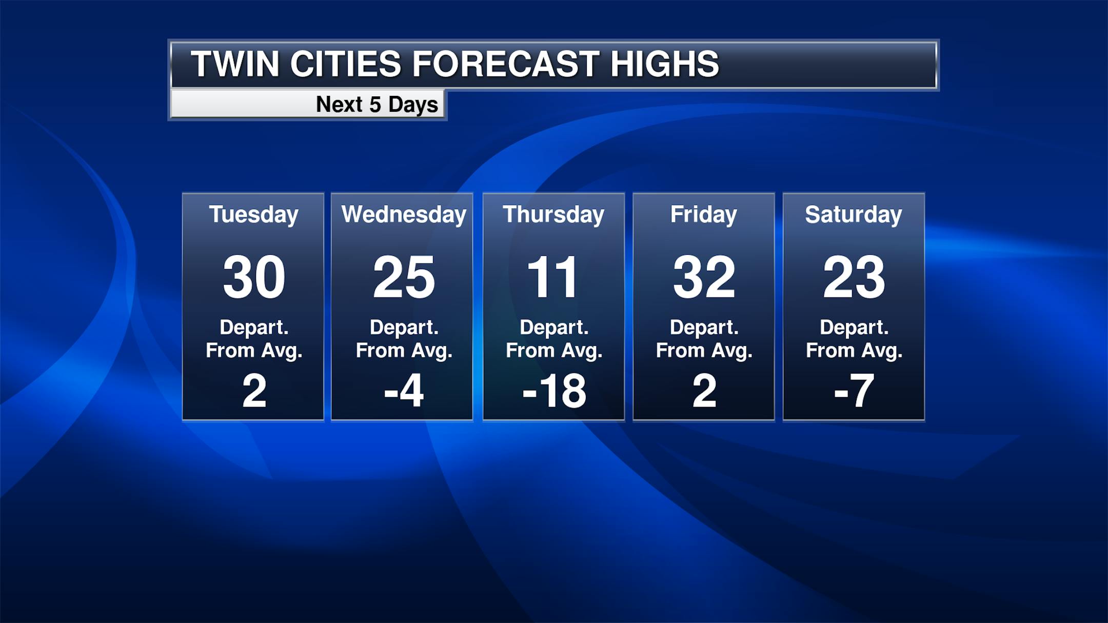 The extended temperature outlook for Minneapolis over the next several days shows temps running closer to average on Tuesday with well below average temps returning on Thursday with highs only warming into the teens.