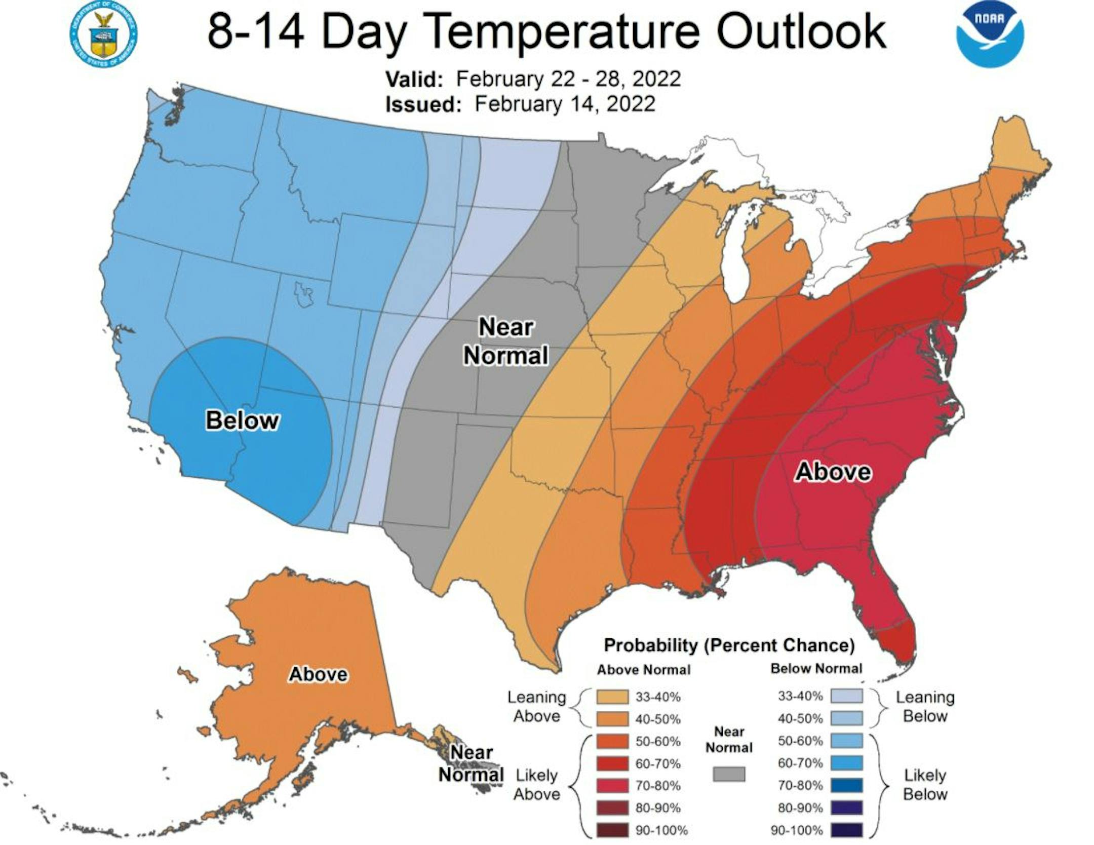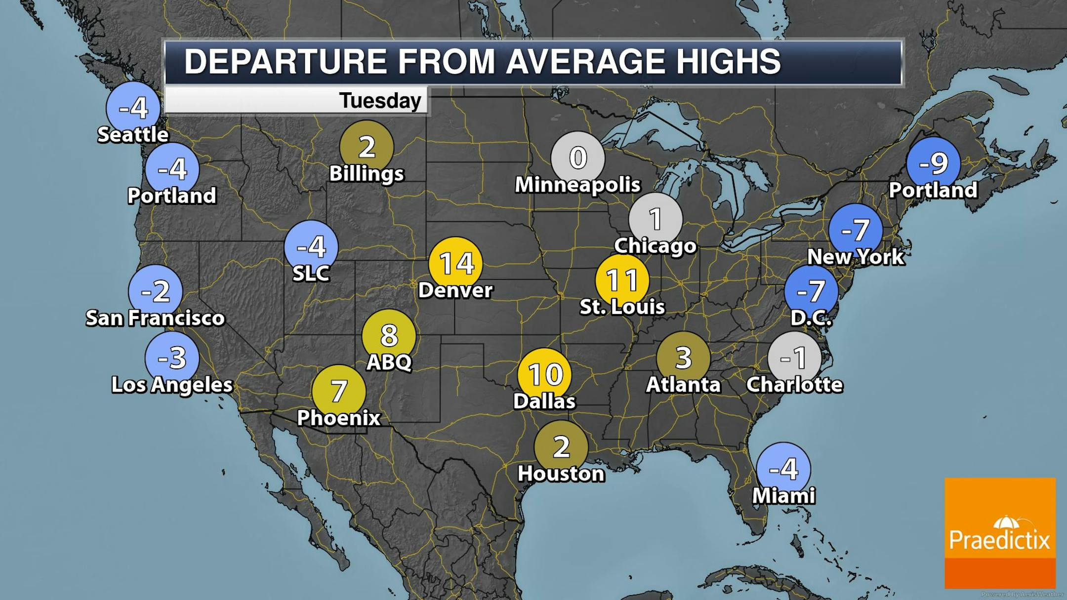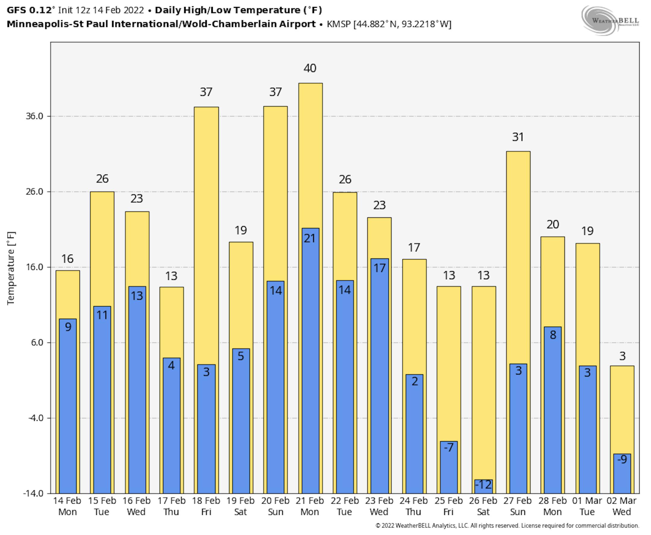 The extended temperature outlook for Minneapolis over the next several days shows temps running closer to average on Tuesday with well below average temps returning on Thursday with highs only warming into the teens.