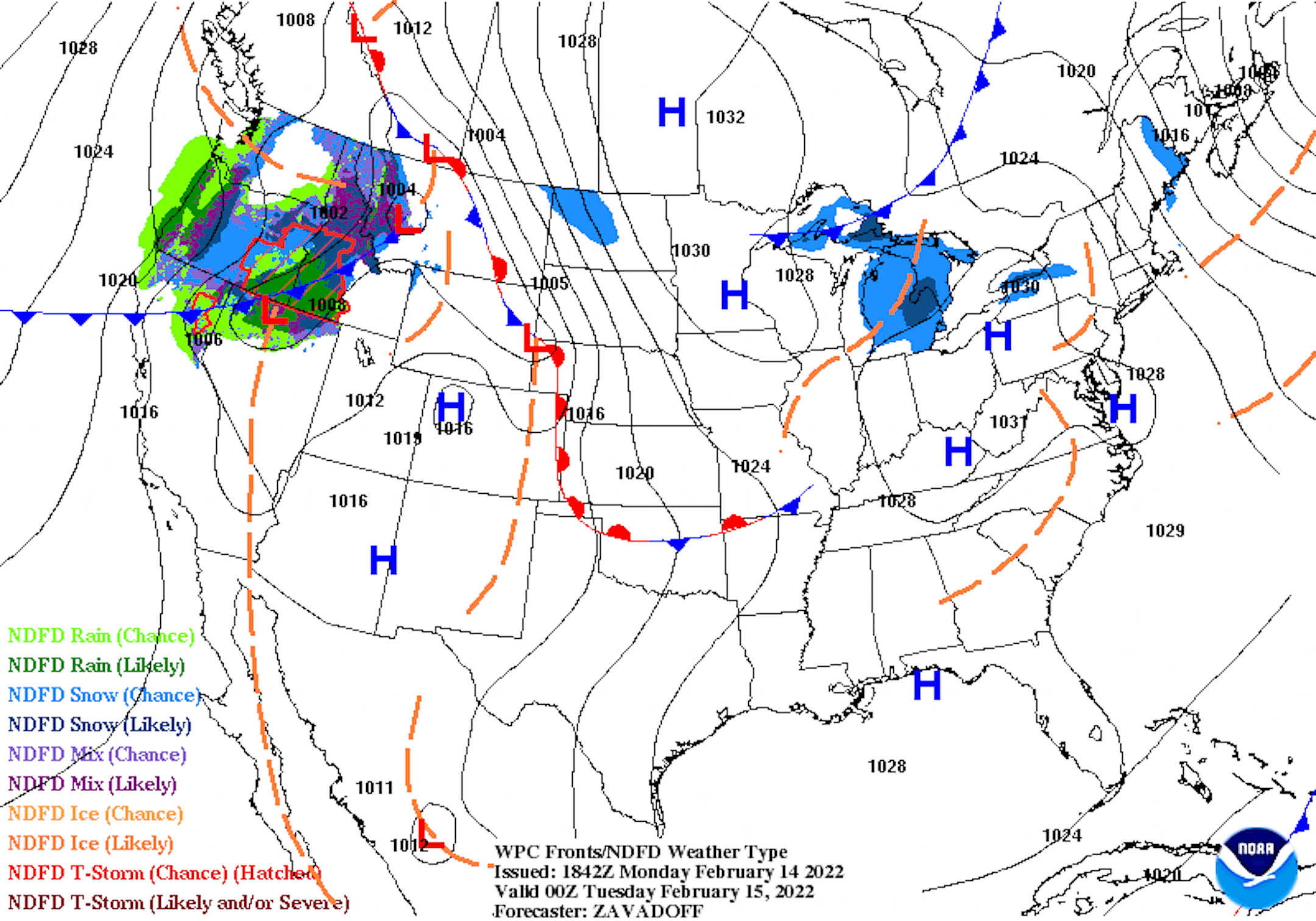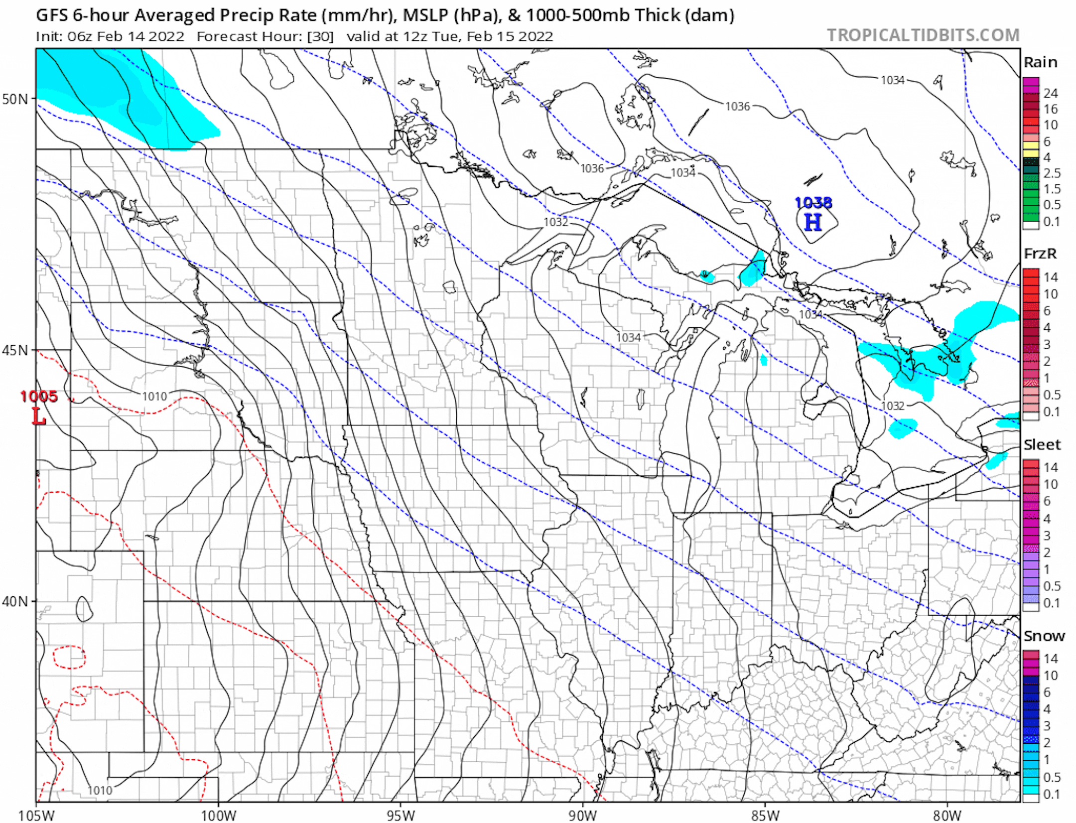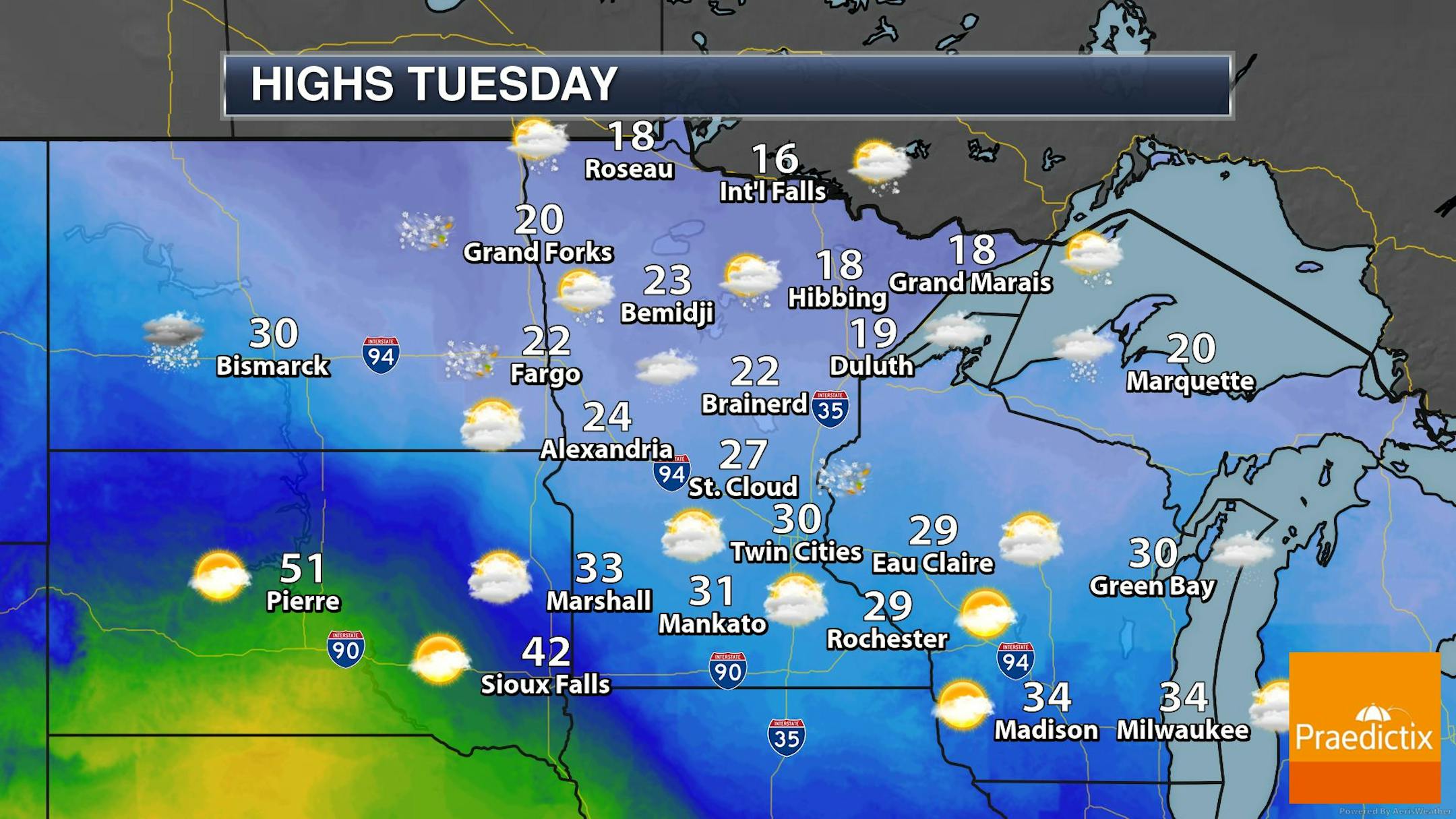 High temps across the region on Tuesday will be warmer than they were on Monday with highs closer to and above average across the southern half of the state. Areas of light snow will be possible in the northern part of the state.