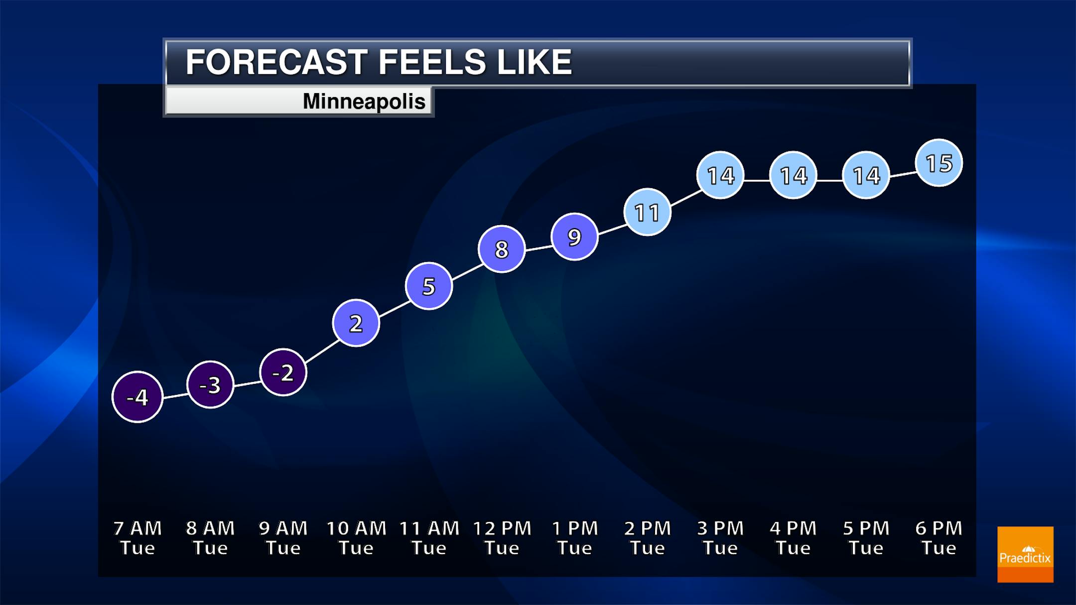 Feels like temps for Minneapolis on Tuesday will start in the single digits below zero in the morning and will only warm into the teens by the afternoon.