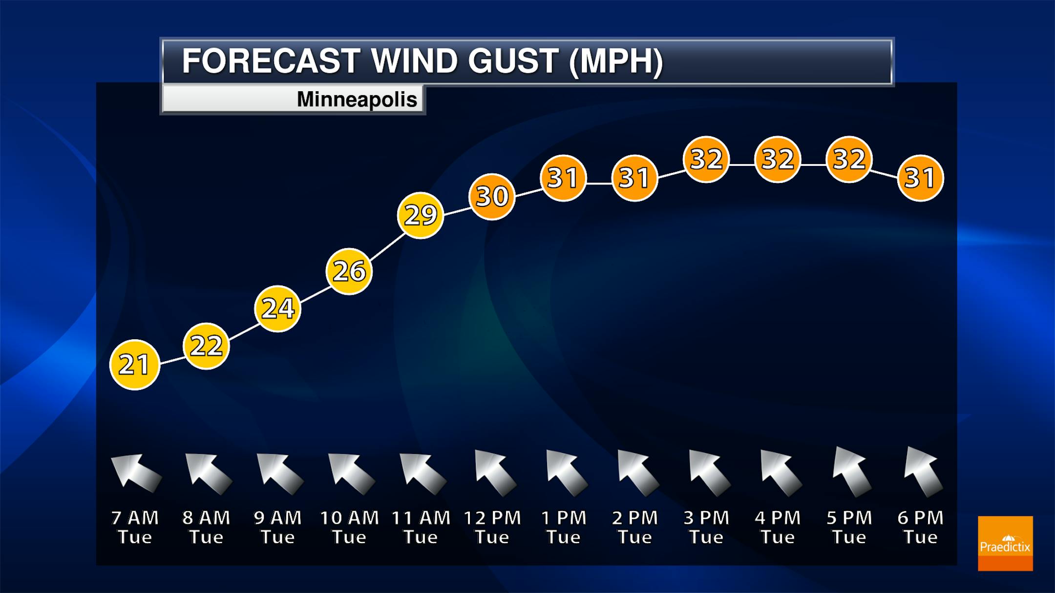 The weather outlook for Minneapolis on Tuesday shows warmer temps in place with highs approaching 30F. Winds will be quite strong with gusts approaching 30mph to 35mph.