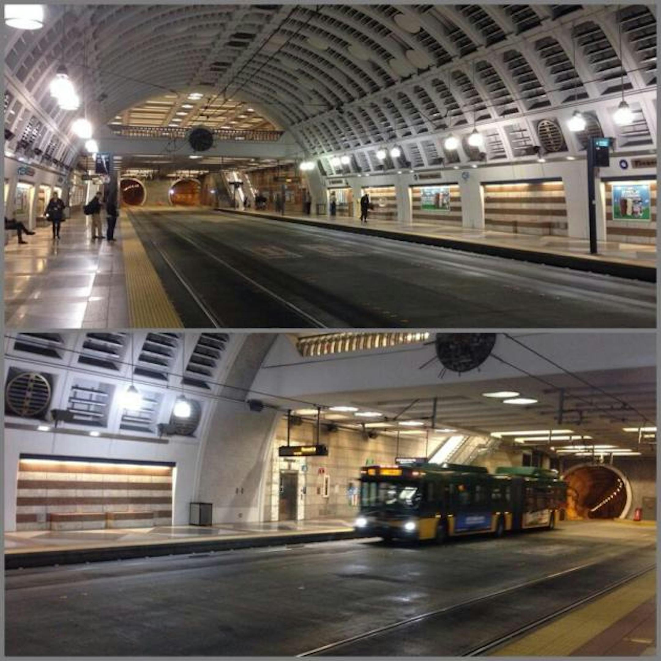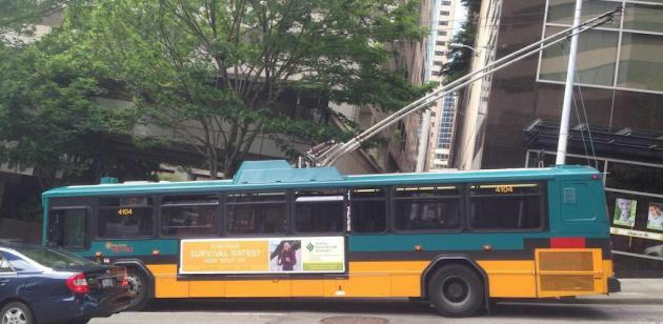 The most obvious difference between the two bus systems is the use of electrified overhead wires that are weaved across Seattle to power the trolley buses. The electric motor makes the buses nearly silent when stopped, much quieter when driving and eases their travel up hills.