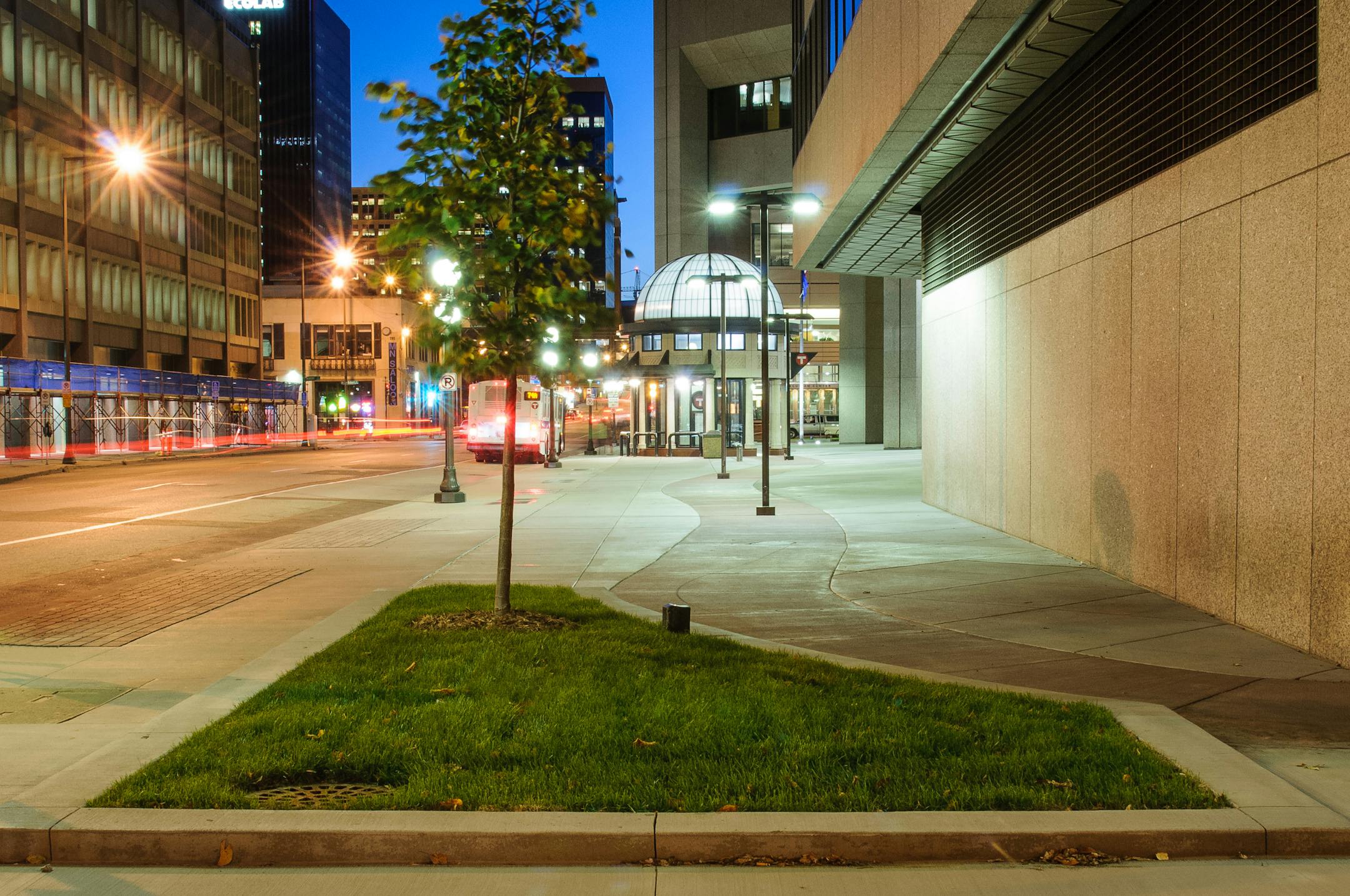 More than 4,000 square feet of new grassy areas were added to soften the streetscape and reduce downtown's heat island effect. Trees were replaced with hardier species, and new environmentally friendly curbside lighting blends better with the firm's 401 building. New planters and patterns in the sidewalk were installed to better define public and private areas.