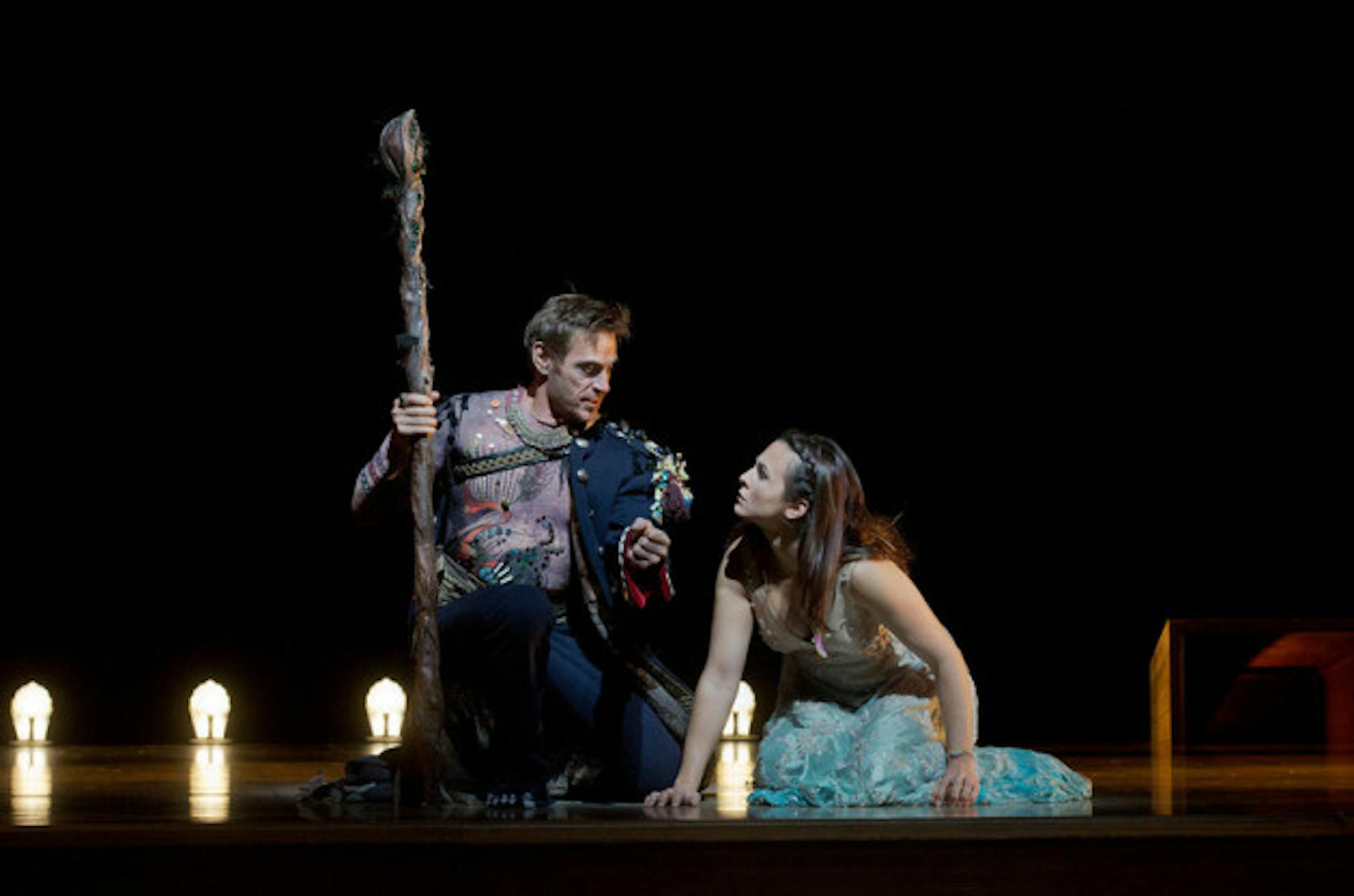 Simon Keenlyside as Propsero and Isabel Leonard as Miranda in composer Thomas Ades' "The Tempest" at the Metropolitan Opera. / Photo by Ken Howard, Metropolitan Opera.